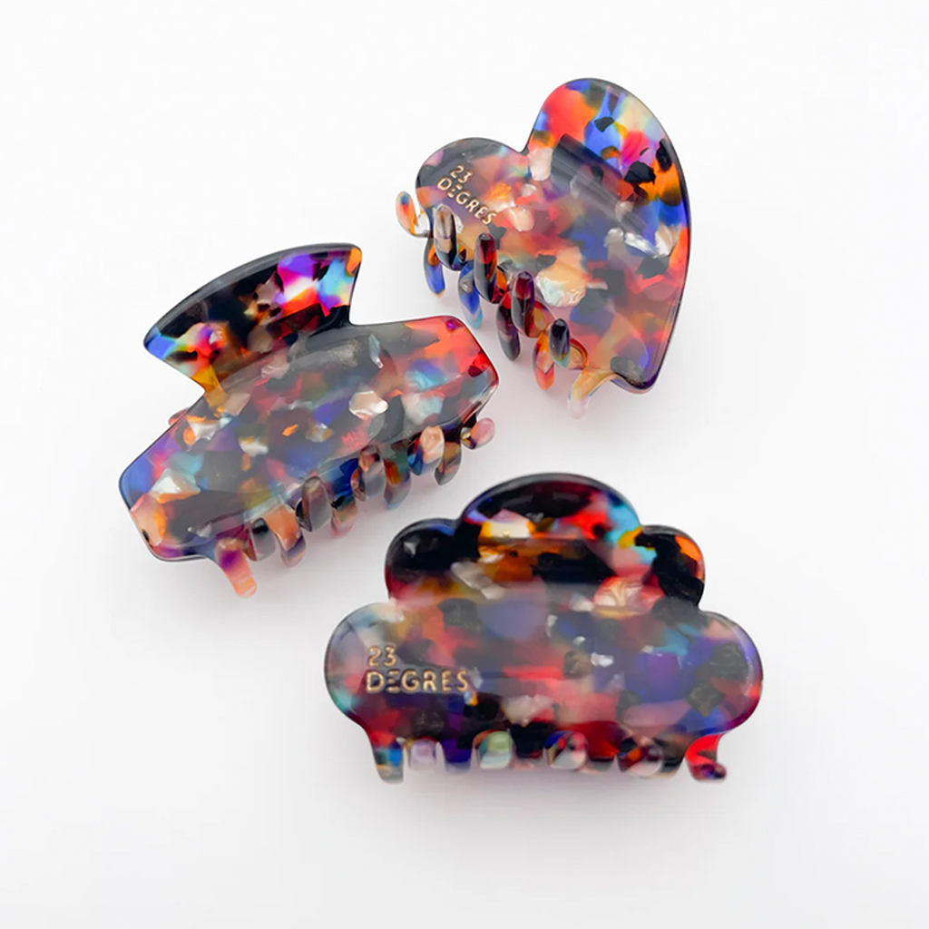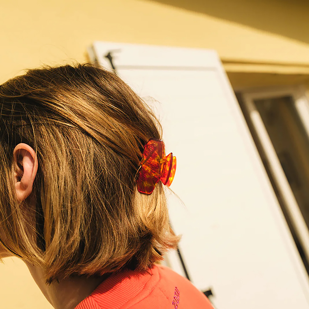 Like all barrettes and clips from 23 Degrés, this large, round barrette is made by hand in the French Jura. It is made from cellulose acetate, an environmentally friendly material of plant origin, which is obtained from cotton and wood fibers – mainly from France or Italy. Thanks to its generous size, this clip is ideal for securing voluminous buns or half-up hairstyles with long hair. It ensures a secure hold all day long without slipping and is particularly suitable for thick hair – for a reliable fit. With its sunny colors, this barrette gives the hairstyle a fresh, lively touch. The multicolored shades – orange, blue, siren tones – bring luminosity and a summery mood to the hair. The biggest challenge is deciding between all the beautiful colors.