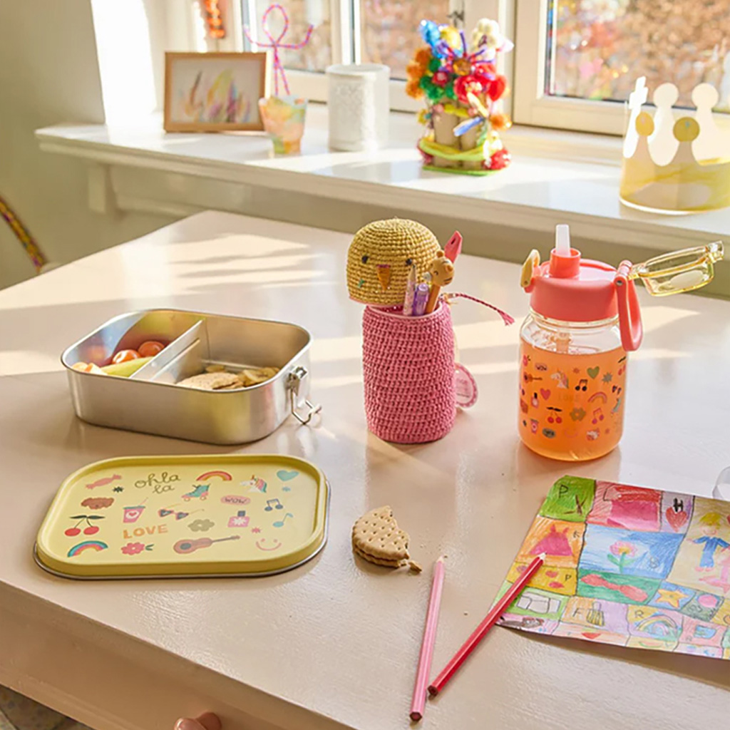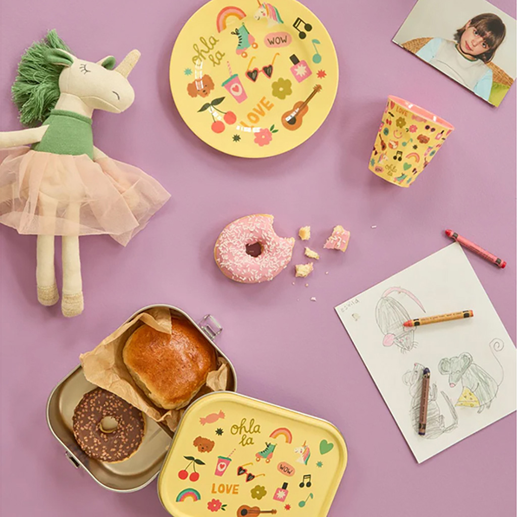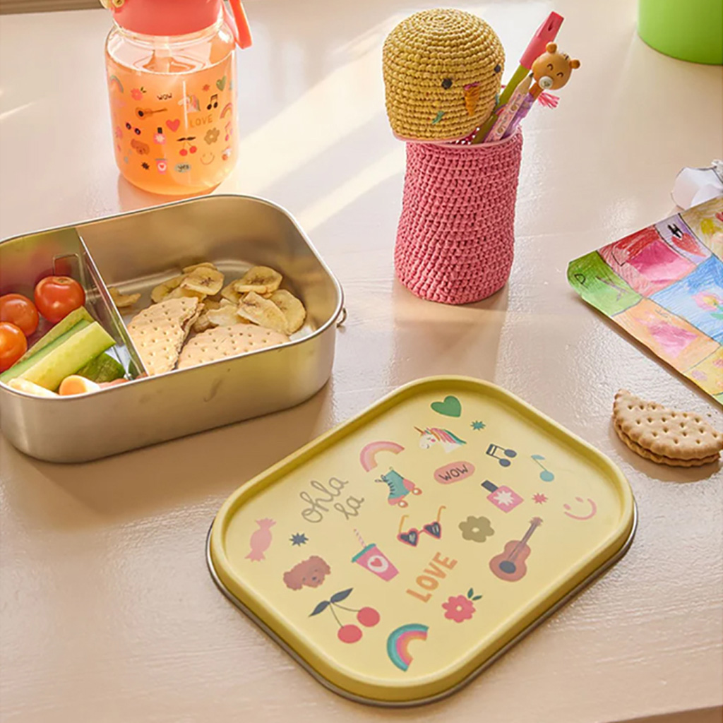 The large stainless steel lunch box will make your lunch break even better. The yellow lid with a cool “Unicorn Love” print and the movable divider ensure that your meals always stay organized and fresh. RICE’s colorful lunch products for children make every bite feel special. Think of cheerful lunch boxes, playful water bottles, sandwich paper with cool prints and snack containers in the most cheerful colors and cute designs. Perfect for school, picnics or snacking at home – because food tastes better with a touch of fun.