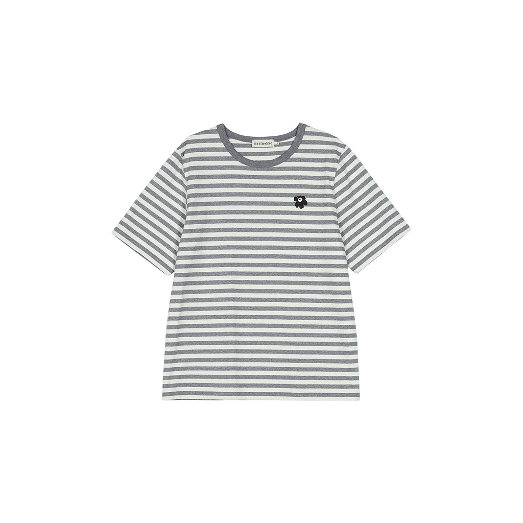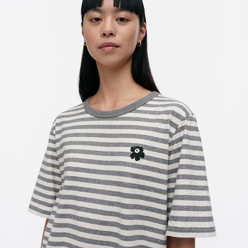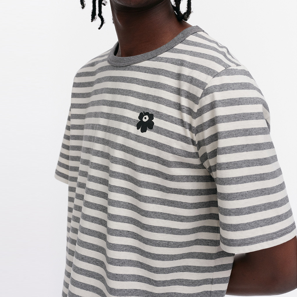 The unisex fit T-shirt is made from organic cotton jersey and features the Tasaraita pattern and the small Unikko flower printed on the front. The T-shirt has a ribbed O-neck. When jeans became increasingly popular with both women and men, Annika Rimala wanted to design a collection of cotton jersey garments to go with jeans. For all denim lovers, regardless of age, size or gender. This is how Marimekko’s first cotton jersey collection was born. Uniformly striped, an expression of equality.