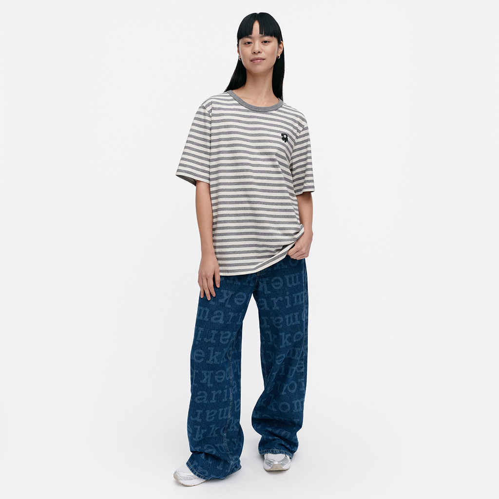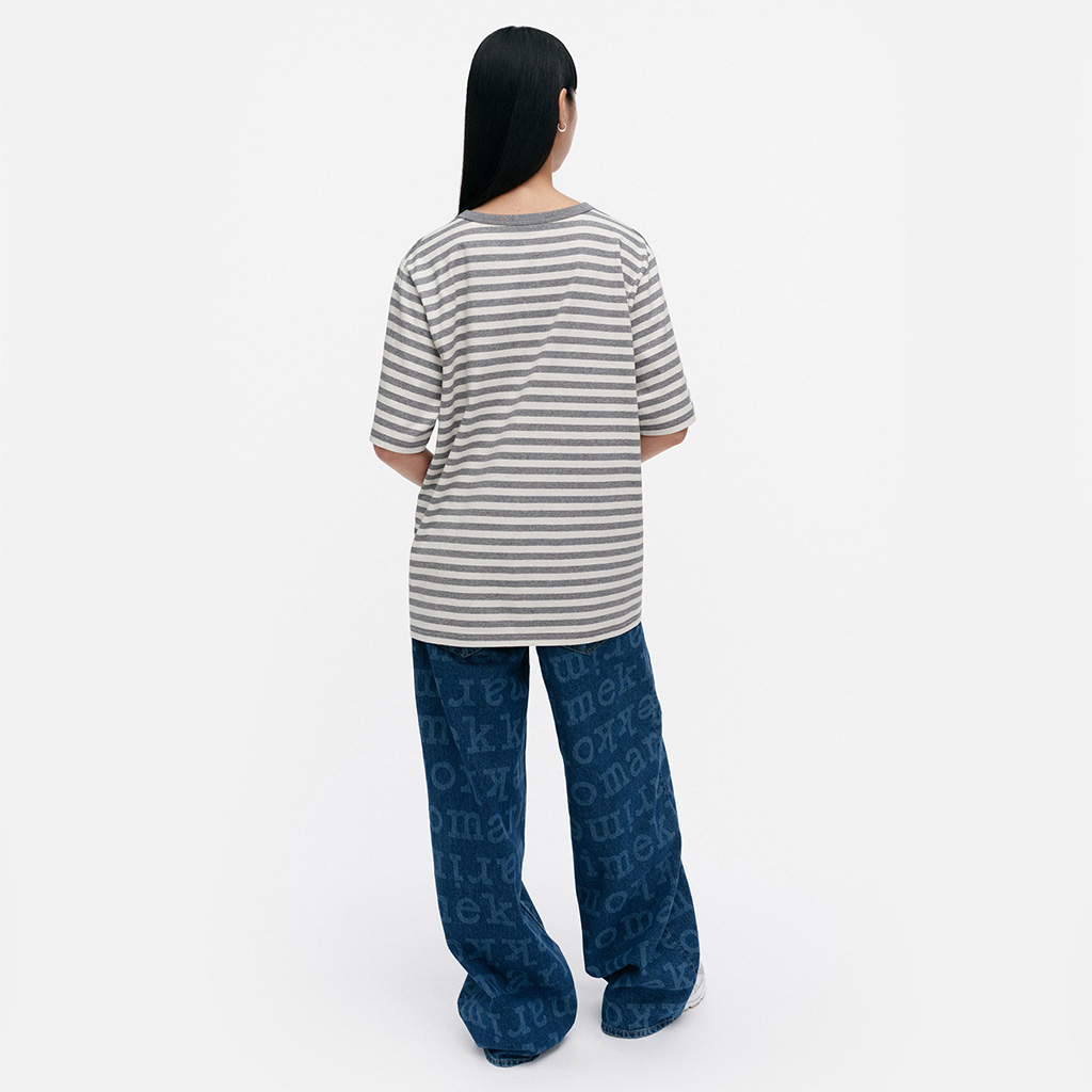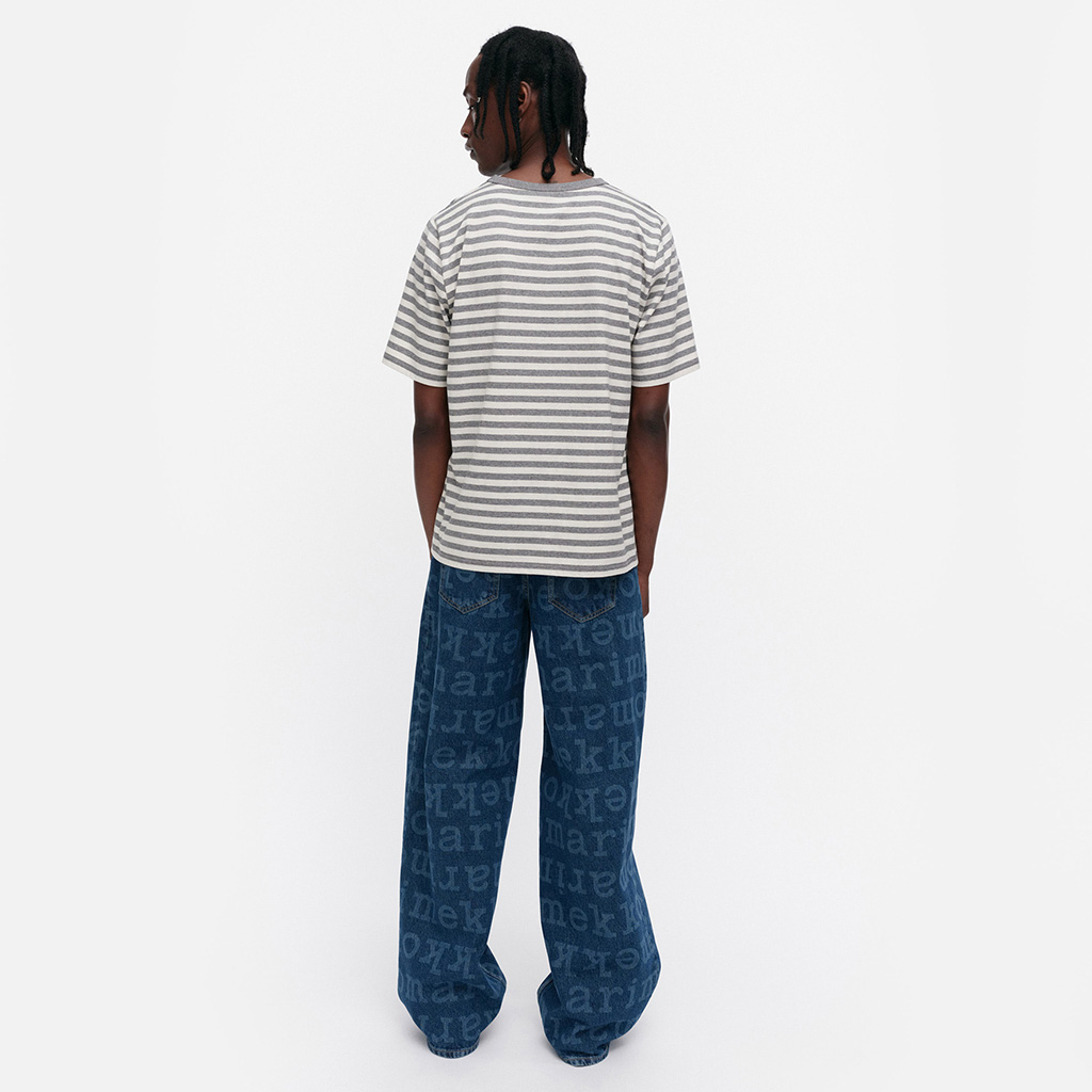 The unisex fit T-shirt is made from organic cotton jersey and features the Tasaraita pattern and the small Unikko flower printed on the front. The T-shirt has a ribbed O-neck. When jeans became increasingly popular with both women and men, Annika Rimala wanted to design a collection of cotton jersey garments to go with jeans. For all denim lovers, regardless of age, size or gender. This is how Marimekko’s first cotton jersey collection was born. Uniformly striped, an expression of equality.