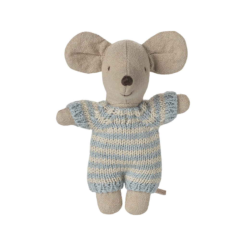 Eine kleine Maileg-Babymaus in einem weichen, gestreiften Strickanzug. Sie schläft stundenlang in ihrer kleinen gesteppten Tragetasche.