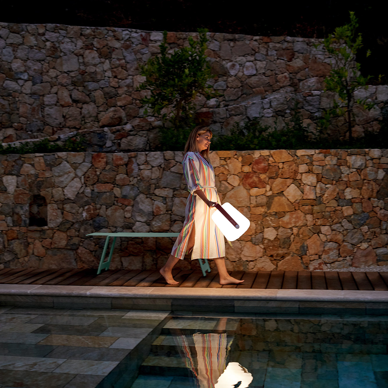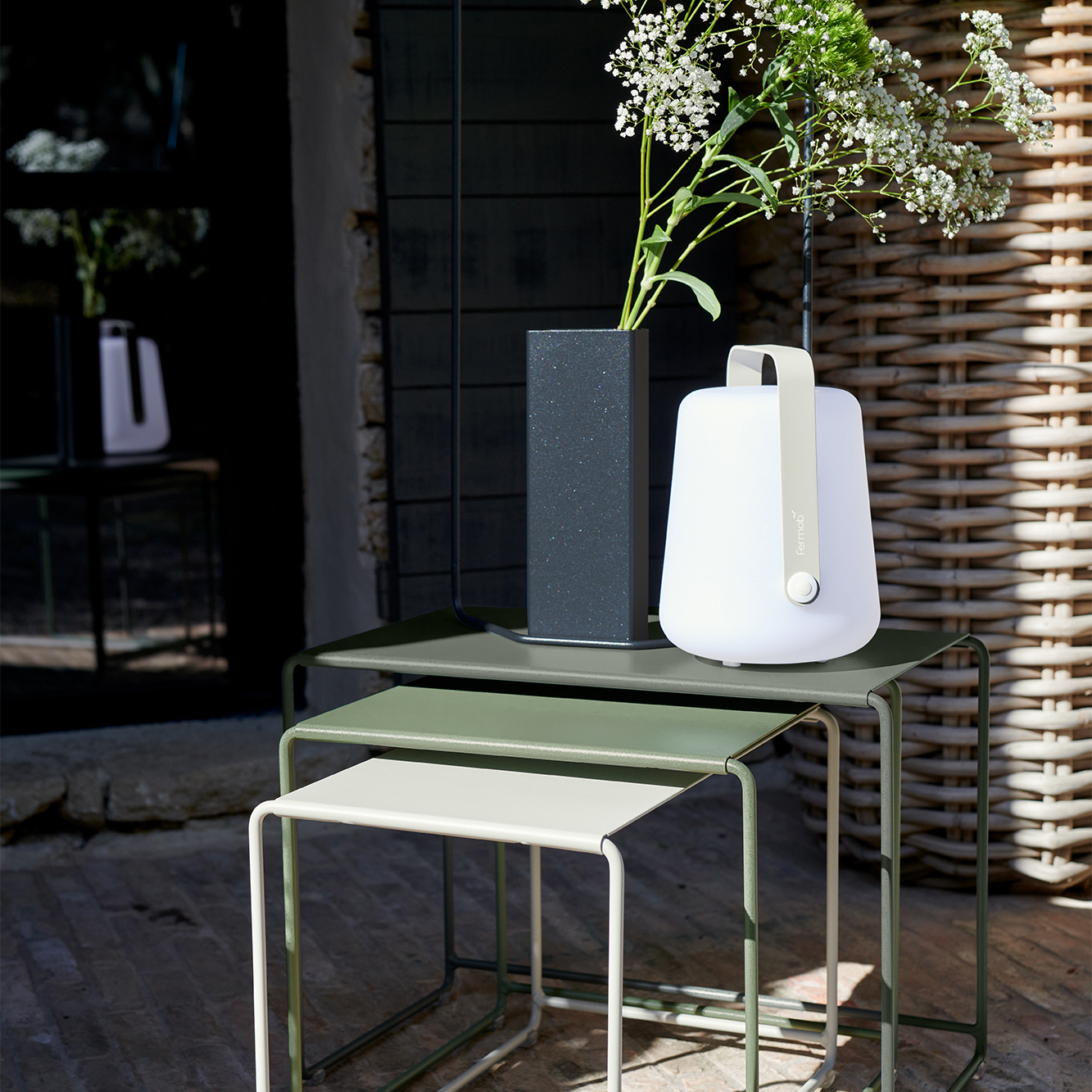 Die H38 Balad ist die XL-Version der ikonischen Fermob-Lampe – eine mobile Designleuchte mit Aluminiumgriff, die als dekoratives, nachhaltiges Objekt für Innenräume modernen Stil und praktische Ästhetik vereint. Sie bietet 150 Lumen, bis zu 16 Stunden Leuchtdauer und verschiedene Lichtfarben von Kaltweiss bis warmem Kerzenflackern, ideal für stimmungsvolle Beleuchtung bis spät in die Nacht.