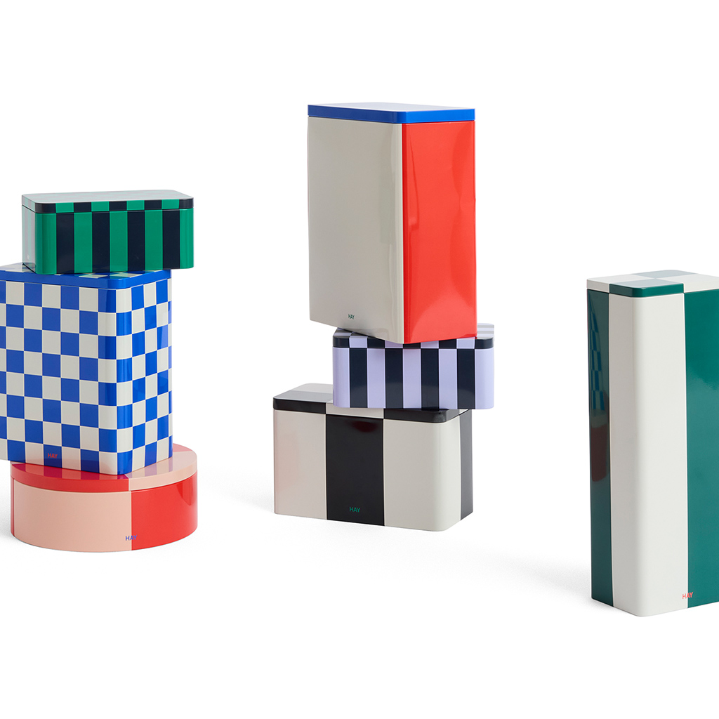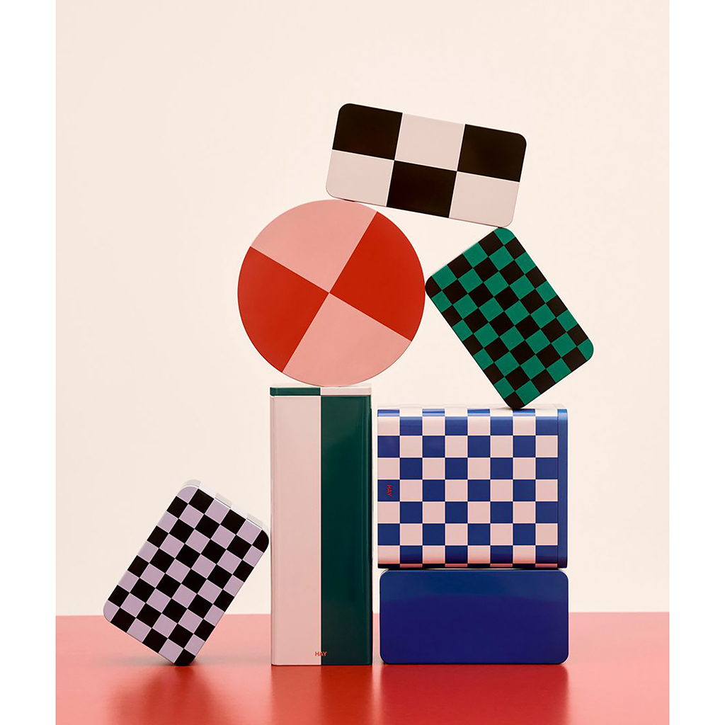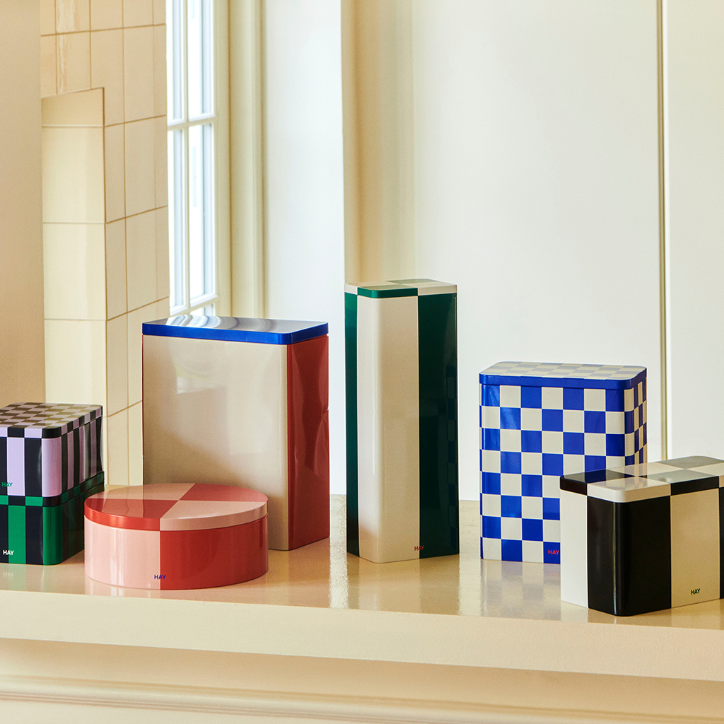 Die Blechbehälter von HAY sind eine Kollektion funktionaler und dekorativer Aufbewahrungsboxen mit farbenfrohen Karomustern und glänzender Oberfläche. Deckel und Behälter sind glatt aufeinander abgestimmt, wodurch ein elegantes, nahtloses Erscheinungsbild entsteht und gleichzeitig ein luftdichter Verschluss gewährleistet wird, der sich für die Aufbewahrung trockener Lebensmittel eignet.