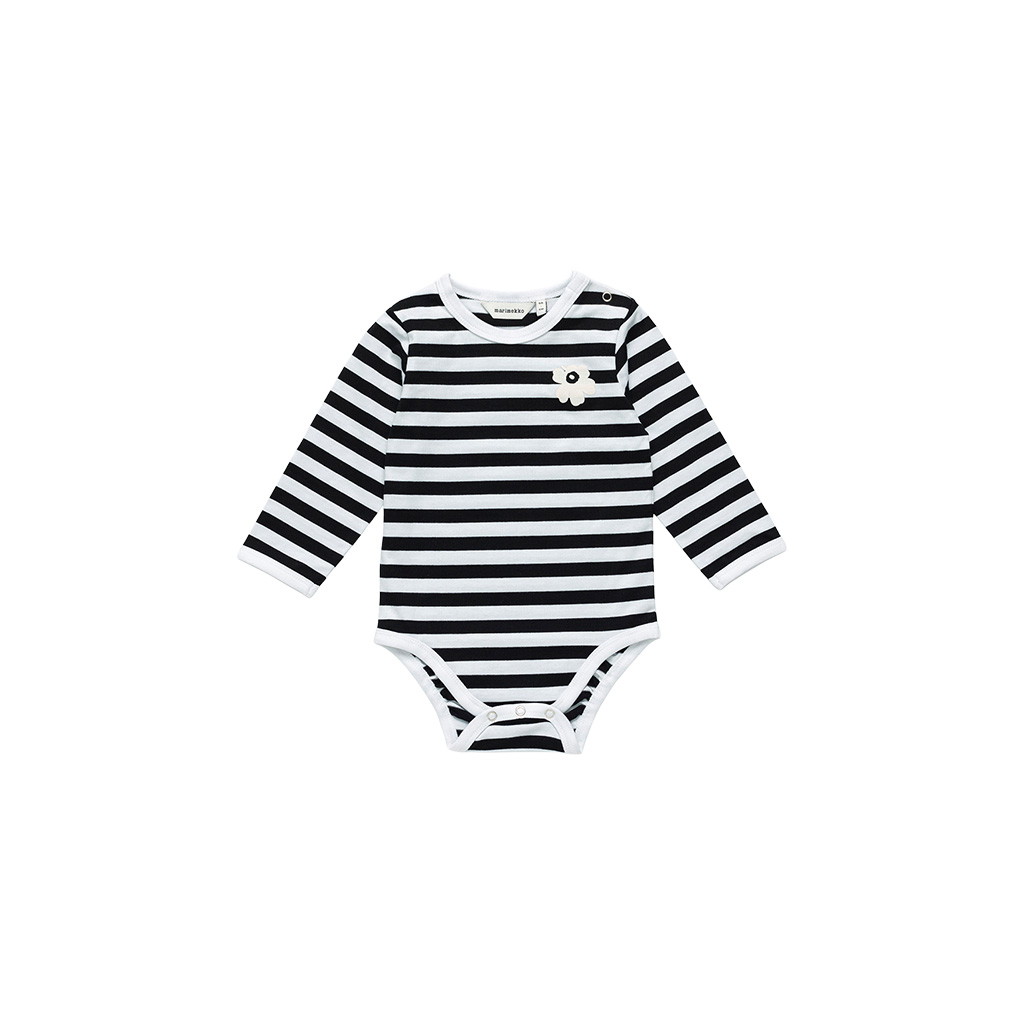 Der langärmelige Vinde-Body ist aus weicher Baumwolle im Tasaraita-Muster gefertigt, das auf der Vorderseite die aufgedruckte Mohnblume im Unikko-Muster zeigt. Er hat Druckknöpfe an der linken Schulter und einen dreifachen Druckknopfverschluss an der Unterseite. Der Halsausschnitt, die Ärmelabschlüsse und die Beinöffnungen sind gerippt. In ihrem ersten Jahr bei Marimekko 1953 entwarf die Designerin Vuokko Eskolin-Nurmesniemi Piccolo, einen gestreiften Stoff, der mit freihändigen Pinselstrichen gemalt wurde. Drei Jahre später wurde ein Hemd mit Piccolo-Aufdruck namens Jokapoika zum ersten Stück Marimekko-Herrenmode, das in die Läden und auf die Straße kam.