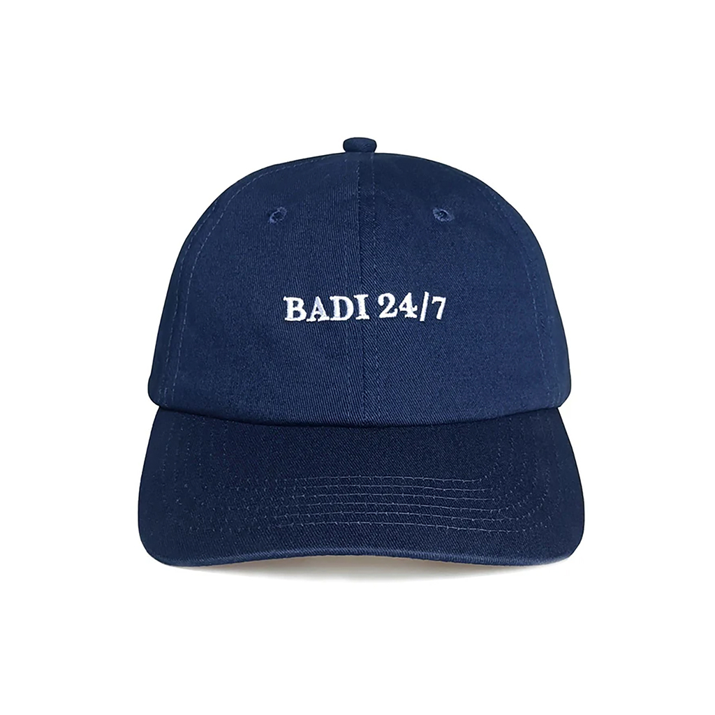 - Farbe: Dunkelblau mit weissem Schriftzug „BADI 24/7“.