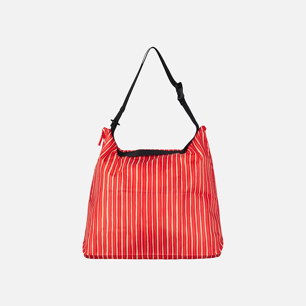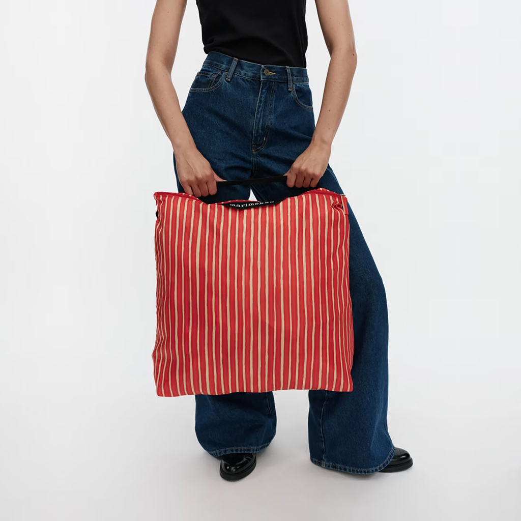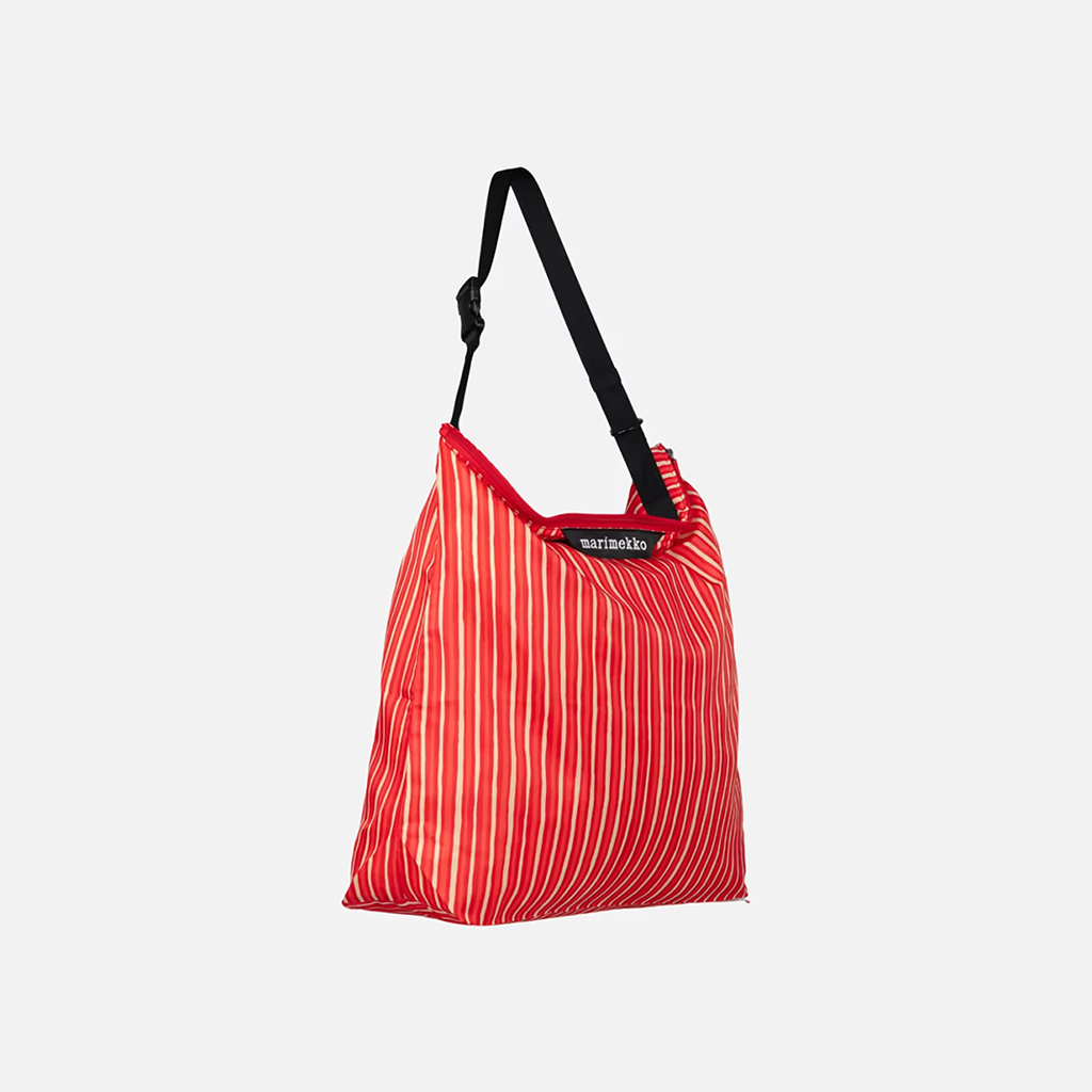 Die Umhängetasche Neat Crossbody L ist aus Polyester im Piccolo-Muster gefertigt. Die Tasche hat einen verstellbaren Schulterriemen. Sie verfügt über einen Reißverschluss, das Marimekko-Label auf der Vorderseite und eine Einschubtasche auf der Innenseite, in der die gesamte Tasche zur einfachen Aufbewahrung verstaut werden kann. Das Hauptmaterial des Produkts besteht aus 100 % recyceltem Polyester und der Schulterriemen aus 100 % recyceltem Polyamid. Im Jahr 1953, dem Jahr ihres Eintritts bei Marimekko, entwarf Vuokko Eskolin-Nurmesniemi Piccolo, ein gestreiftes Stoffmuster, das mit lebhaften Pinselstrichen gemalt wurde. Drei Jahre später erschien das Jokapoika-Hemd (Jeder Junge) aus diesem Stoff in den Geschäften und auf den Strassen – und das, wie es scheint, für immer.