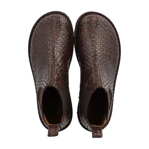 Der Stiefel hat eine abgerundete Spitze, funktionelle elastische Seiten und einen Fersenriemen, der das An- und Ausziehen erleichtert, eine gepolsterte Innensohle, ein chromfreies Lederfutter und eine helle, weiche und flexible FSC-zertifizierte dunkelbraune Gummisohle aus erneuerbarem Naturkautschuk. Dies ist ein Naturprodukt. Der obere Teil des Schuhs besteht aus natürlich pflanzlich gegerbtem Leder und wird in Indien handgewebt, wodurch jedes Paar einzigartig ist. Farbe und Muster können variieren. Behandeln Sie sie mit Sorgfalt.