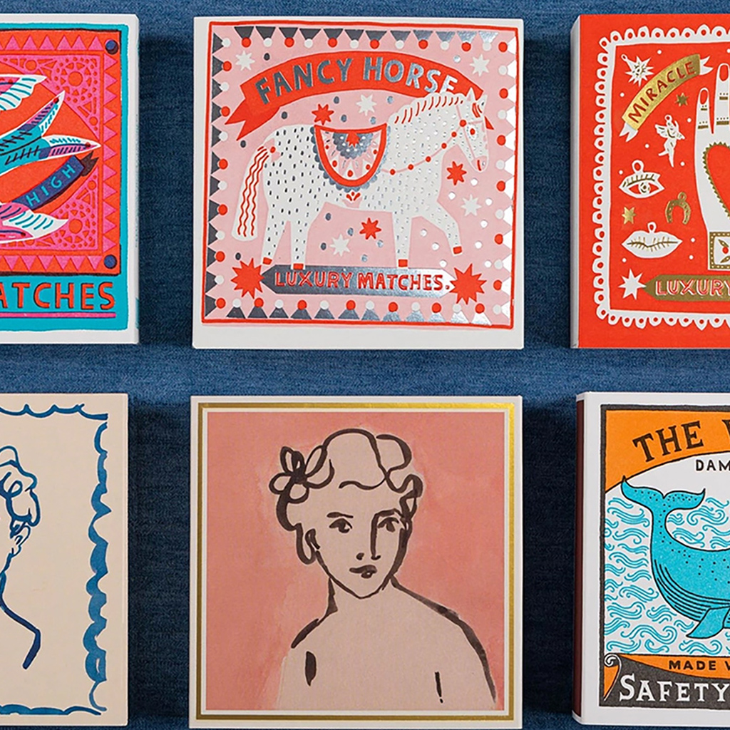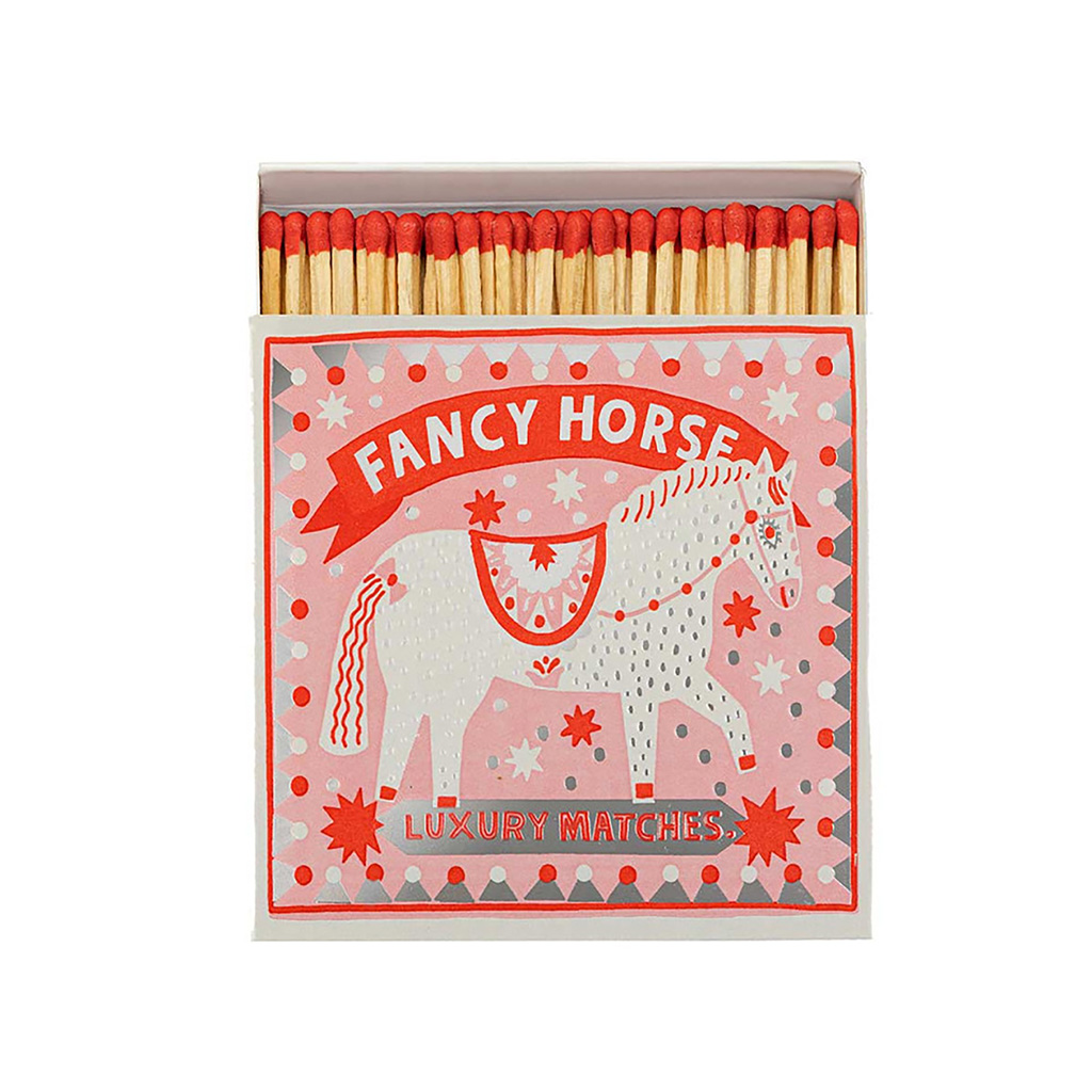 Die für Archivist charakteristische quadratische Streichholzschachtel mit der Illustration eines Pferdes in der Mitte auf babyrosa Hintergrund mit roten und weißen Sternen und silbernen Folienverzierungen sowie dem Schriftzug „Fancy Horse, Luxury Matches”. Diese in jeder Hinsicht auffälligen Streichholzschachteln enthalten 125 Streichhölzer, die bereit sind, ein wenig Freude zu entfachen. Jede Schachtel wurde entworfen, um Couchtischen, Kaminsimsen und Geschenkschubladen Charakter zu verleihen, und ist eine Mischung aus Funktionalität und Flair.