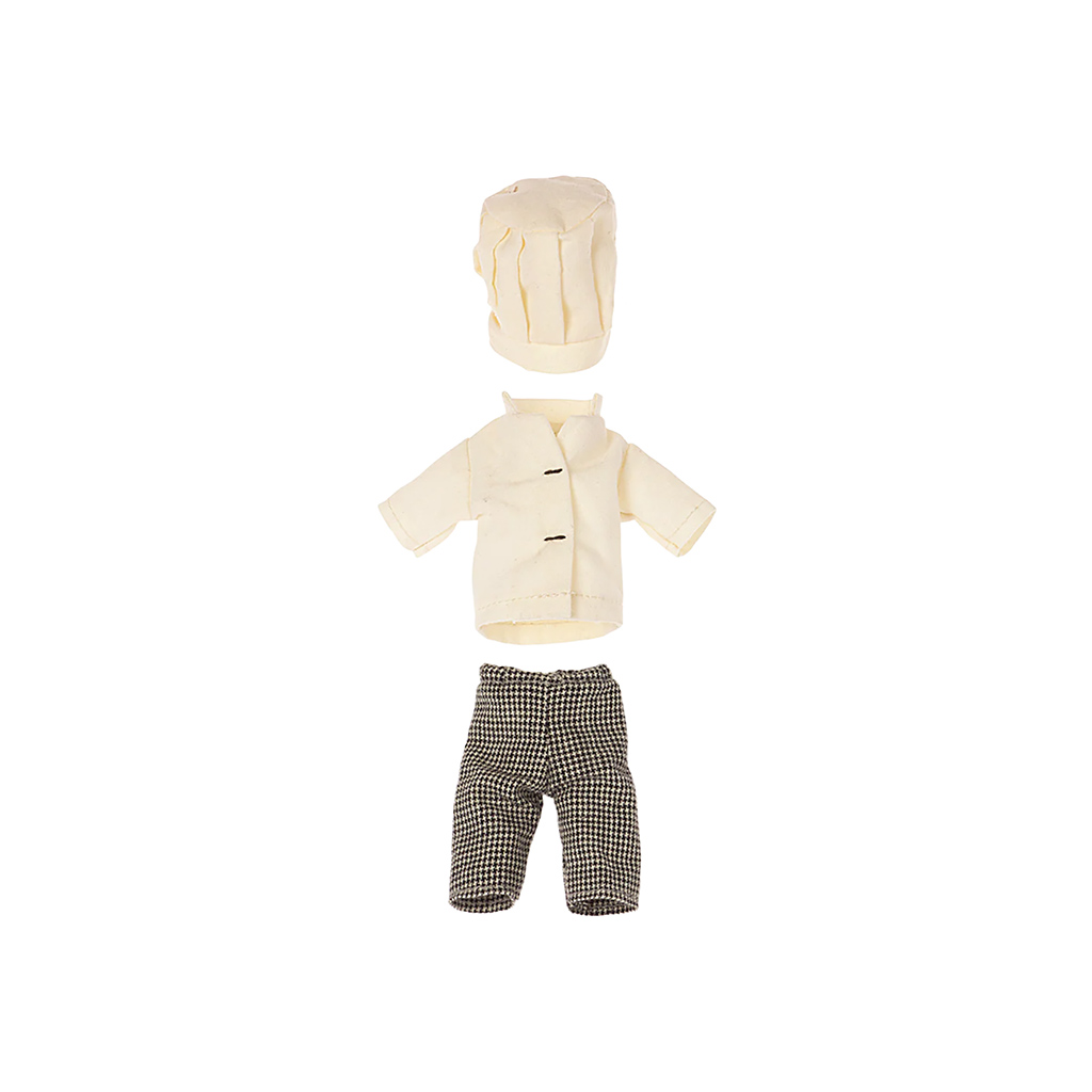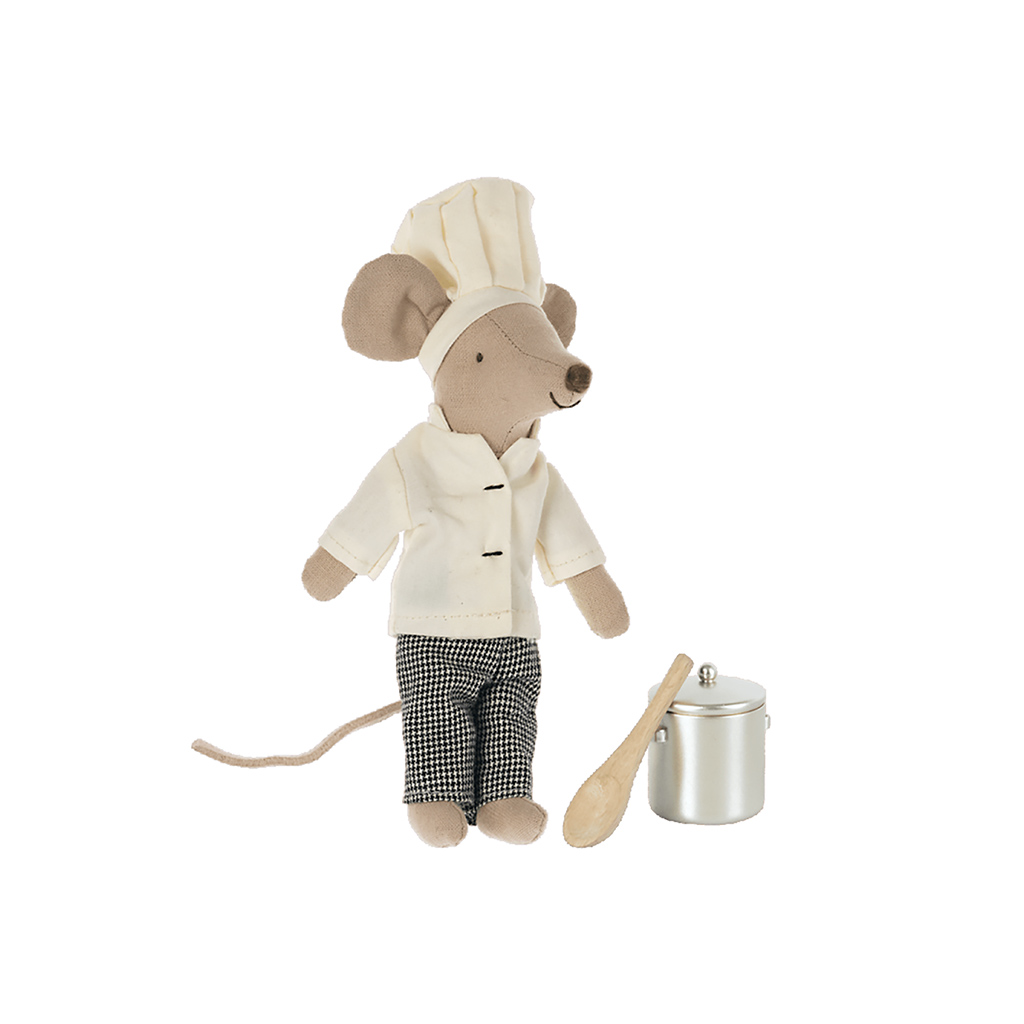 Im Mäuseschloss gibt es natürlich einen Chefkoch. Er trägt eine grosse Kochmütze, eine weisse Kochweste und natürlich karierte Hosen. Er bringt seinen eigenen Kochtopf mit Kochlöffel gleich selber mit.