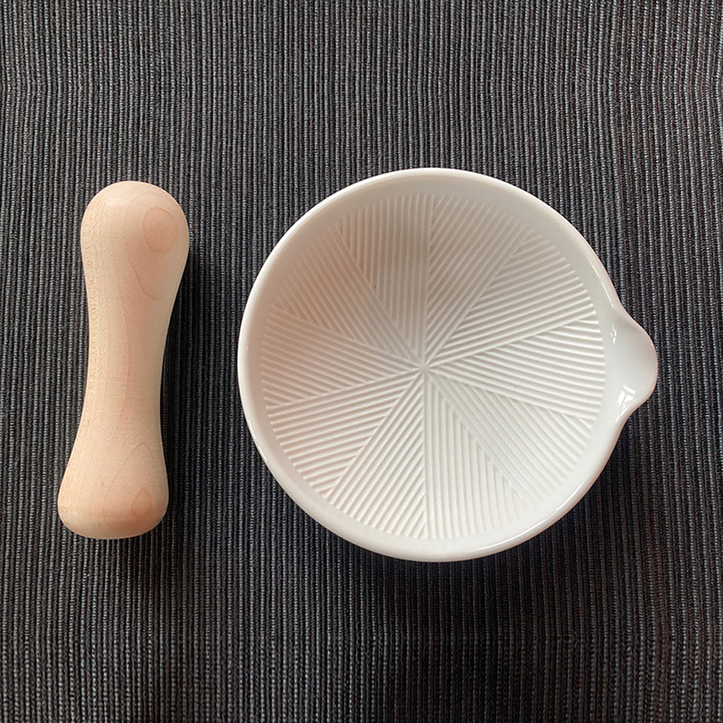 Der stapelbare Porzellanmörser mit seiner schönen Struktur eignet sich perfekt, um kleine Mengen Gewürze oder Kräuter stilvoll und im Handumdrehen zu mahlen. Der Stößel aus Ahornholz mit seiner ergonomischen Form liegt sicher in der Hand und ist dennoch leicht und einfach zu bewegen. Verwenden Sie es zusammen mit anderen Sitaku-Produkten wie dem Hinoki-Schneidebrett mit Porzellanteller, der Ingwerreibe, der Zitronenpresse und Aufbewahrungsbehältern.
