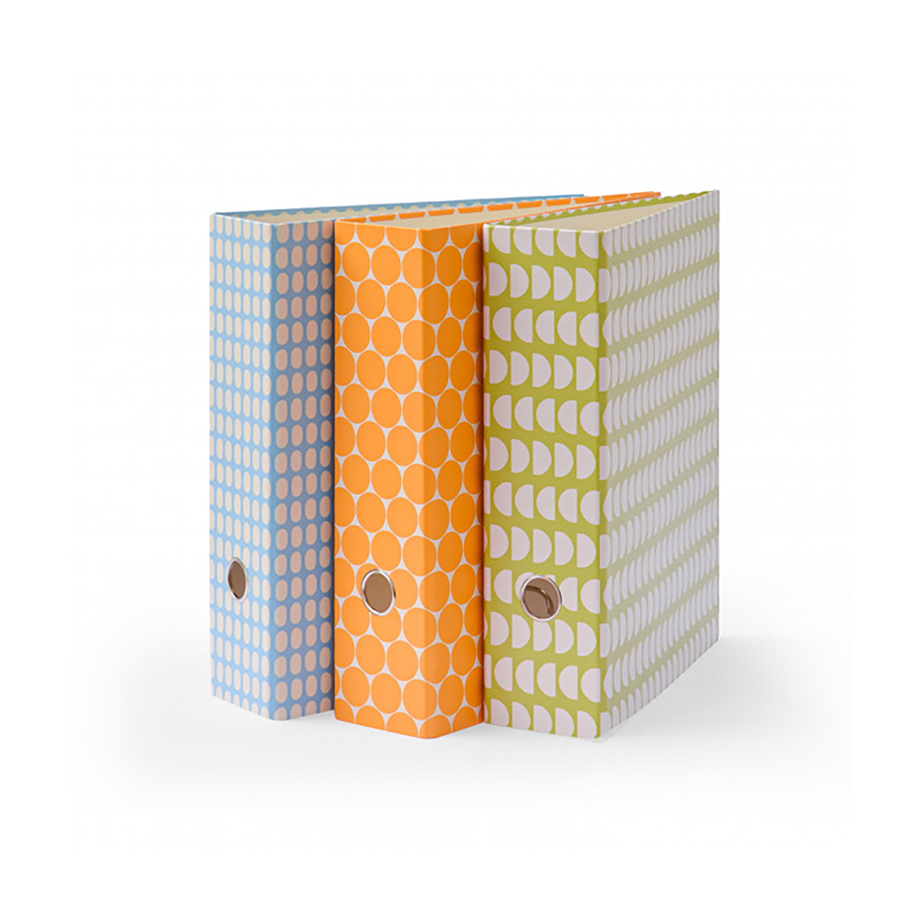 Mit den handgefertigten Ordnern im Standardformat (geeignet für DIN A4) können alle Akten, Kontoauszüge, Fotos, Kochrezepte, gesammelten Kindergemälde und vieles andere mehr – farbenfroh gemustert – archiviert werden. Die Ordner haben einen breiten Rücken (8 cm) mit Eingriff-Loch, eine 2-Ring Hebelmechanik (Standardlochung) und stehen in verschiedenen Einbänden aus TOVE Buntpapier zur Auswahl.