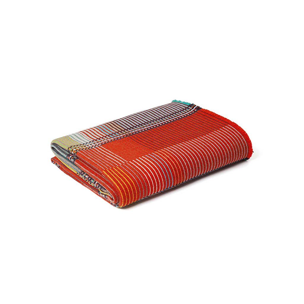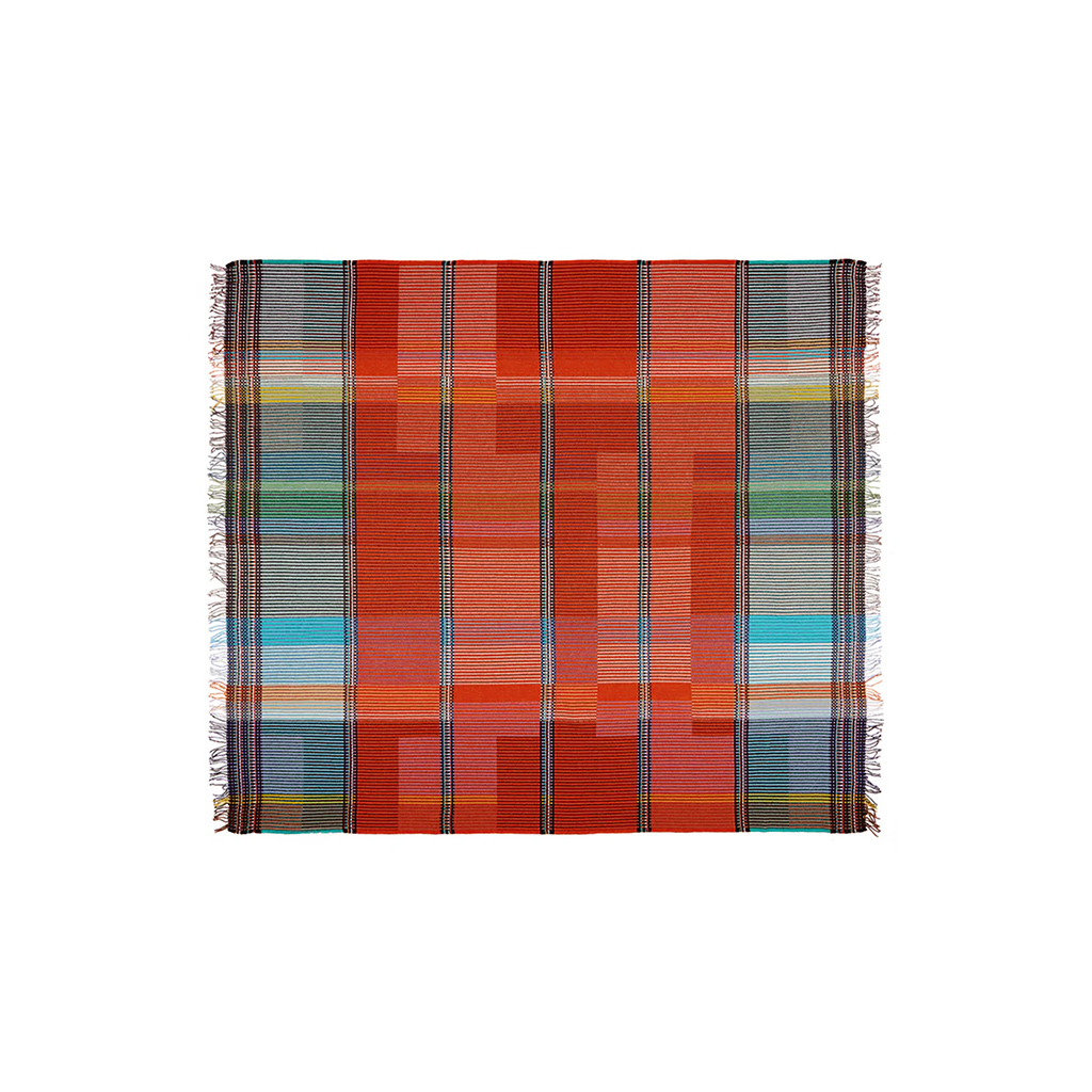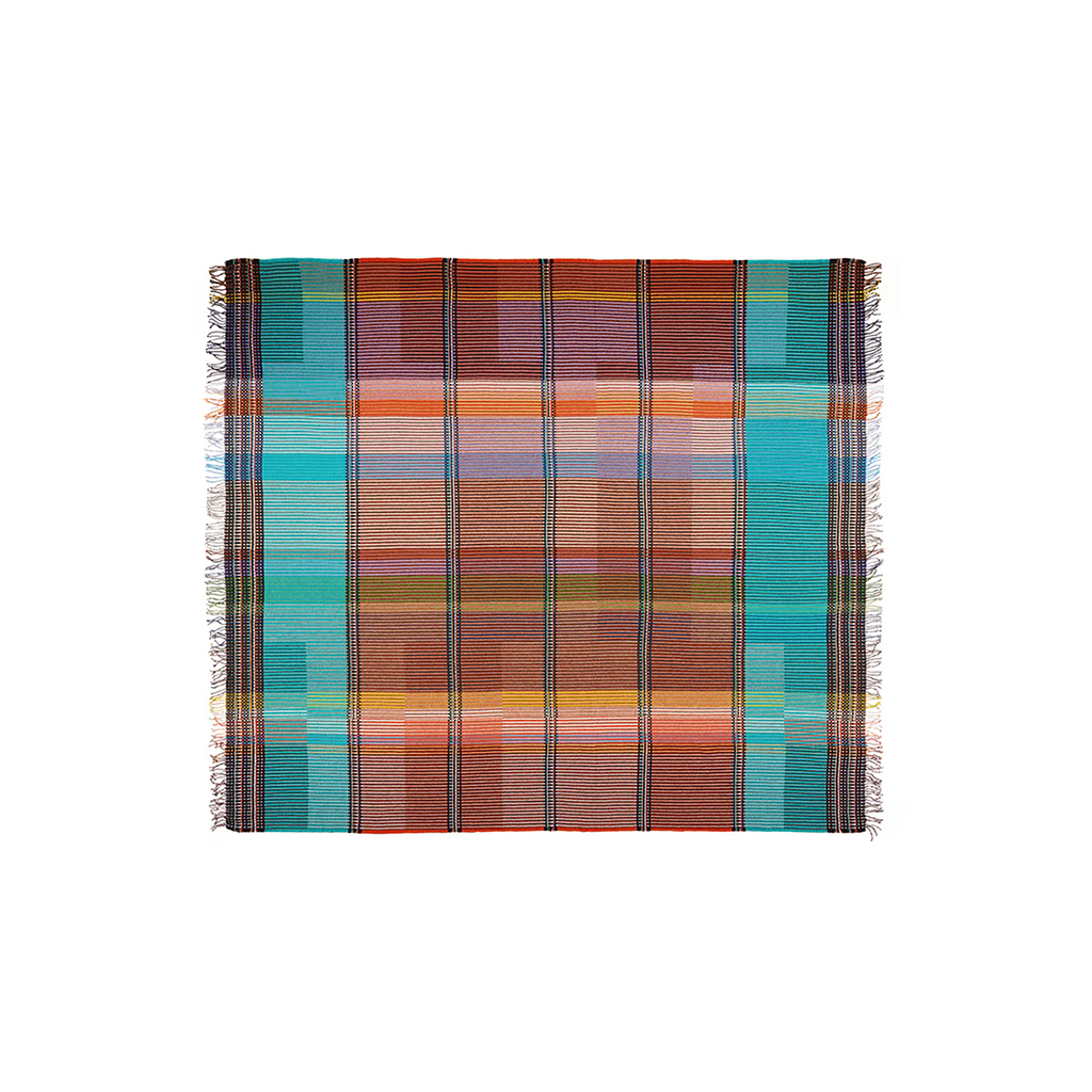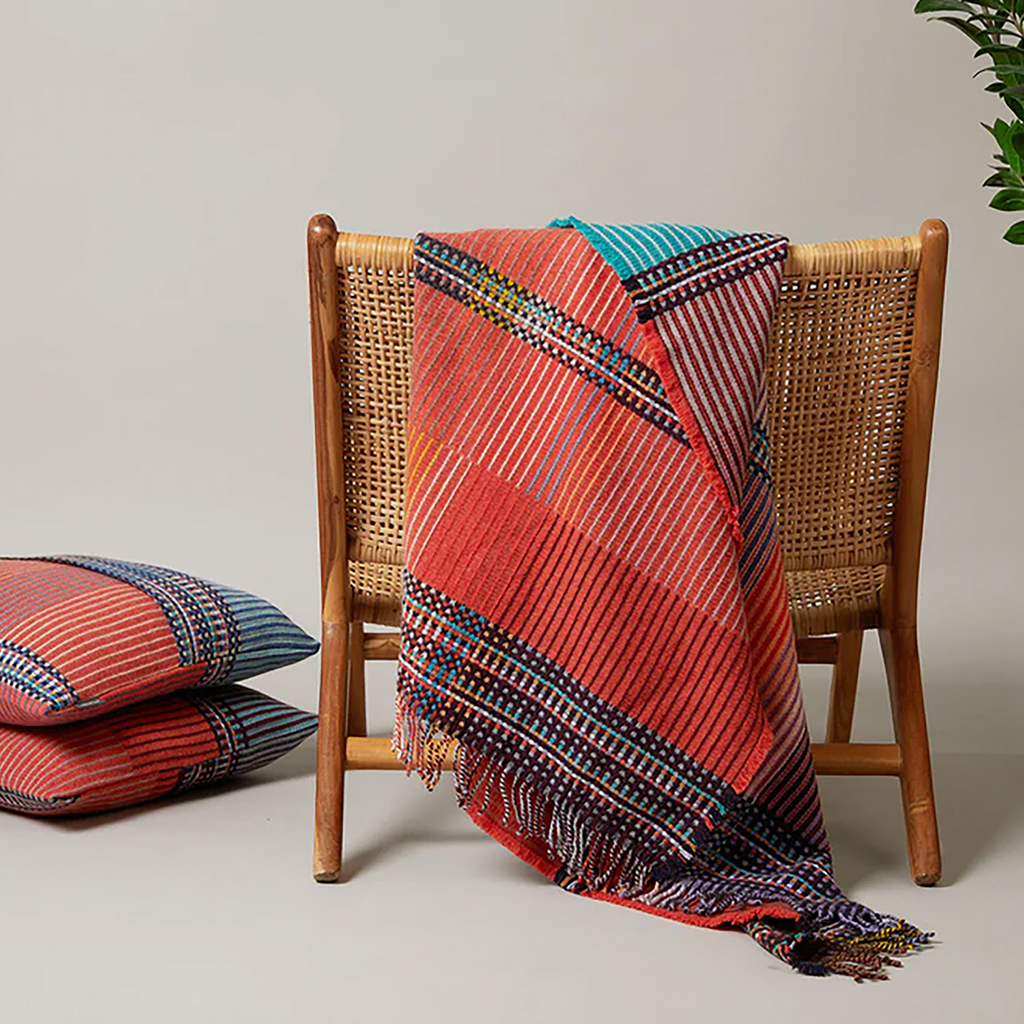 Ida besticht durch ein auffälliges Design in kräftigem Orange, das durch ein intensives Blaugrün kontrastiert wird, während die aufwendig gestreiften Bereiche von tieferen Blaubeertönen geprägt sind. Die aus Merino-Lammwolle gewebten Wallace & Sewell Pinstripe-Überwürfe kombinieren kräftige Farbblöcke mit feinen, detaillierten vertikalen Streifen. Dieses doppelseitige Design verfügt ausserdem über einen kontrastierenden, pixelartigen Rand und ist eine atemberaubende Ergänzung für jeden Raum.