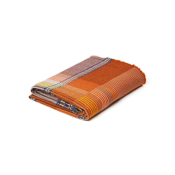 Vita zeichnet sich durch eine gemütliche Farbpalette aus warmen und rostigen Orangetönen mit einem sanften Rosarot aus. Kräftige kobaltblaue Streifen ziehen sich durch das gesamte Design, ergänzt durch kleinere Streifen in tiefem Grün, Buttergelb und Himmelblau. Die aus Merino-Lammwolle gewebten Wallace & Sewell Pinstripe-Überwürfe kombinieren kräftige Farbblöcke mit feinen, detaillierten vertikalen Streifen. Dieses doppelseitige Design hat außerdem einen kontrastierenden, pixelartigen Rand und ist eine atemberaubende Ergänzung für jeden Raum.