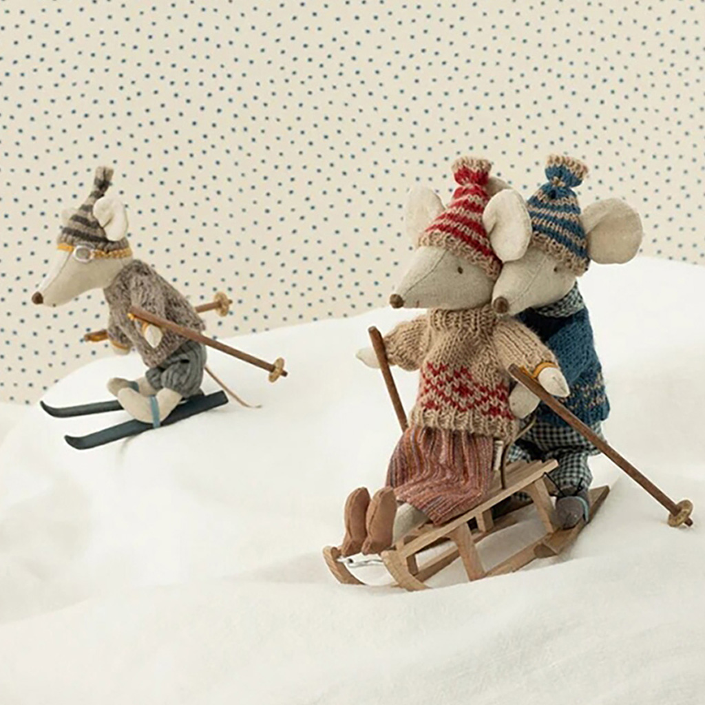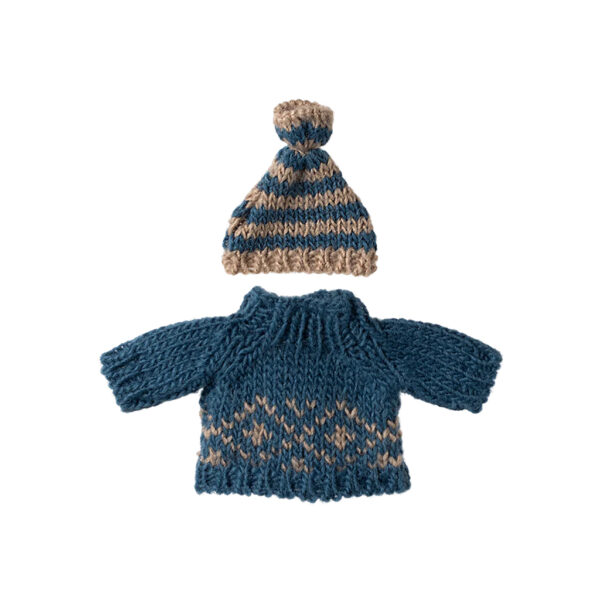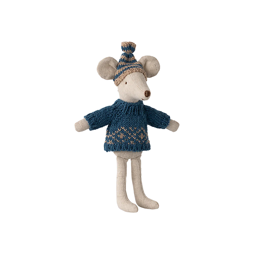 Juhuuu Winter! Auch der Maileg Mäusepapa liebt es im Schnee rumzutollen und draussen mit den Mäusekindern zu spielen. Dieser nordisch inspirierte blaue Strickpulli und die dazu passende Mütze hält Papa Maus kuschlig warm.