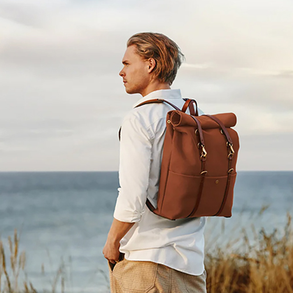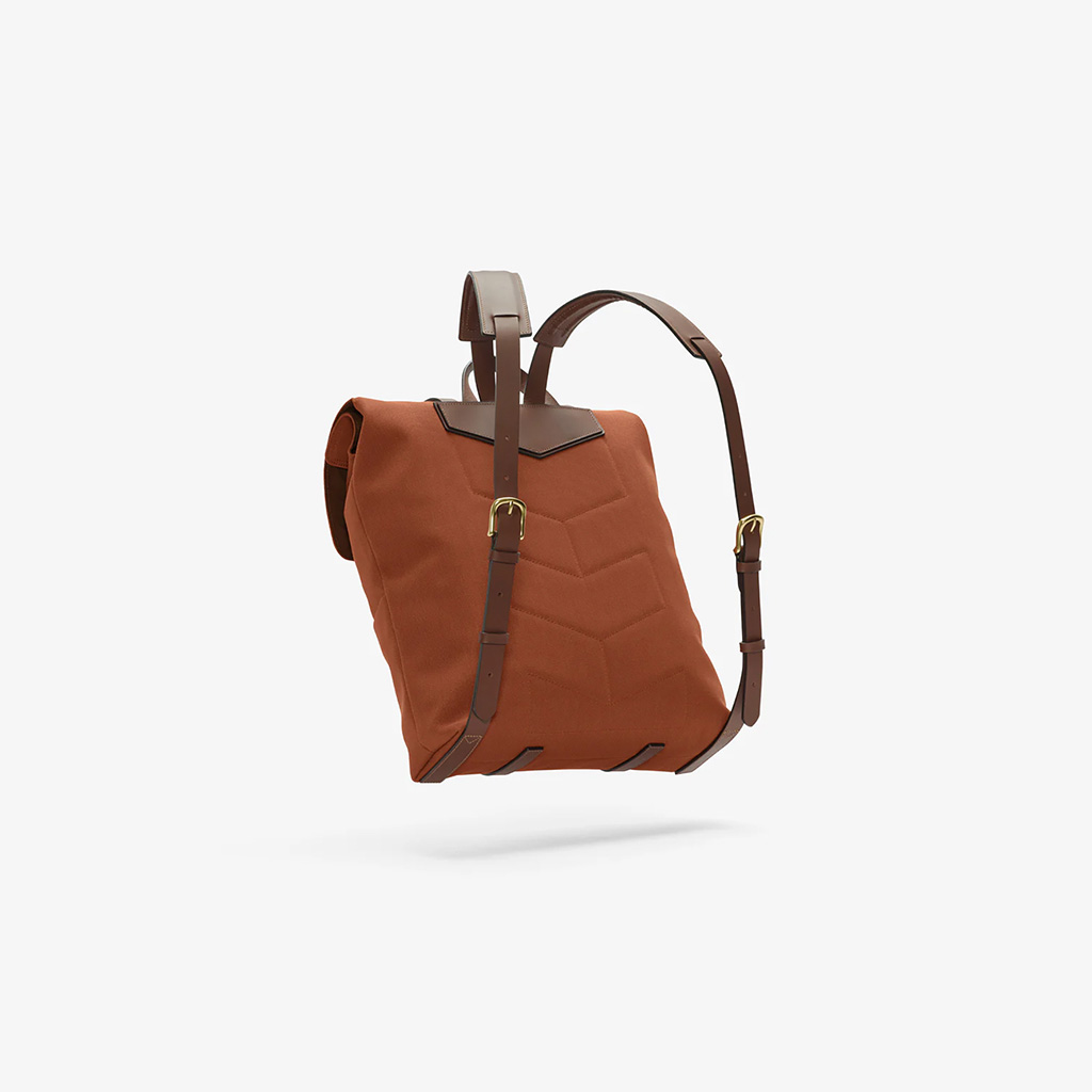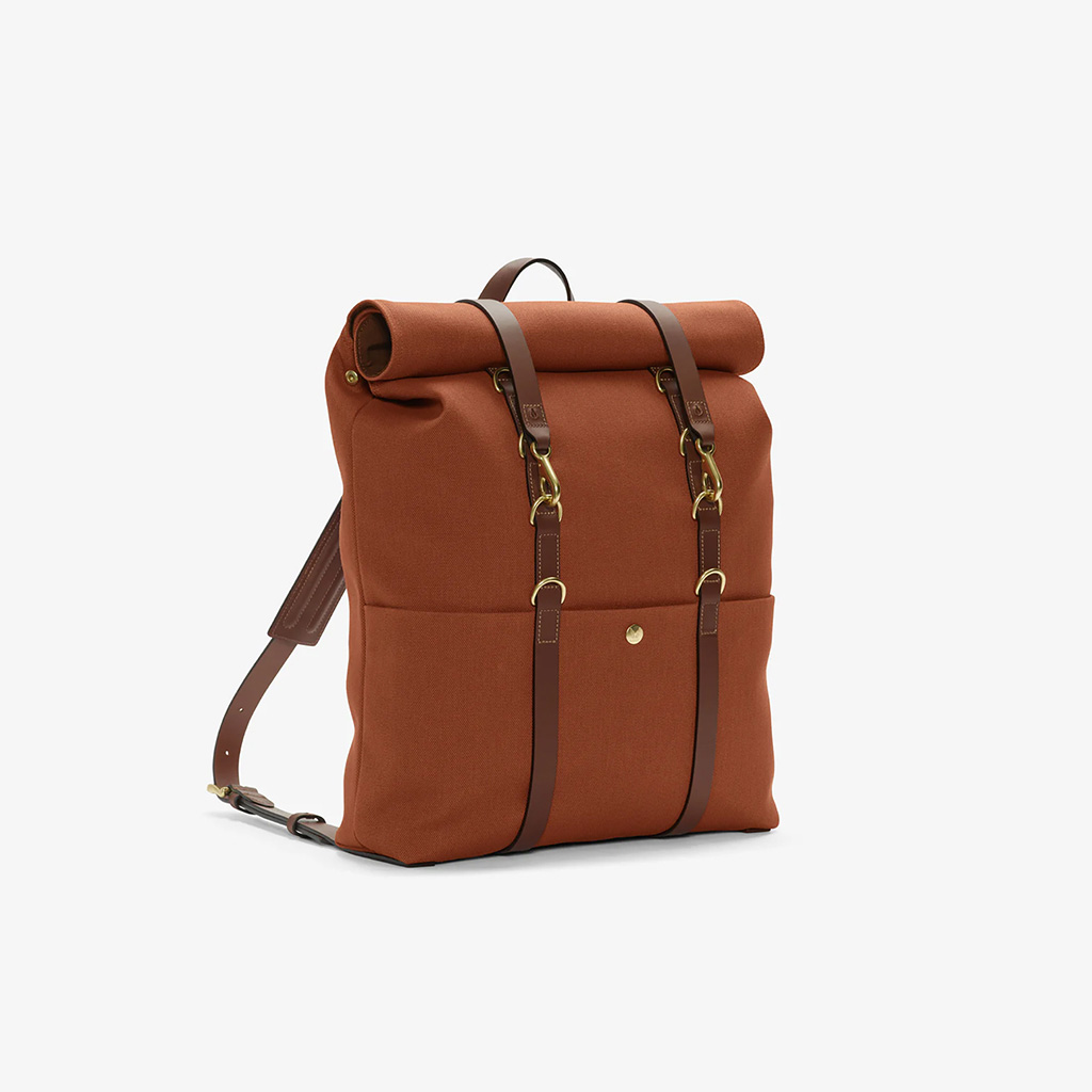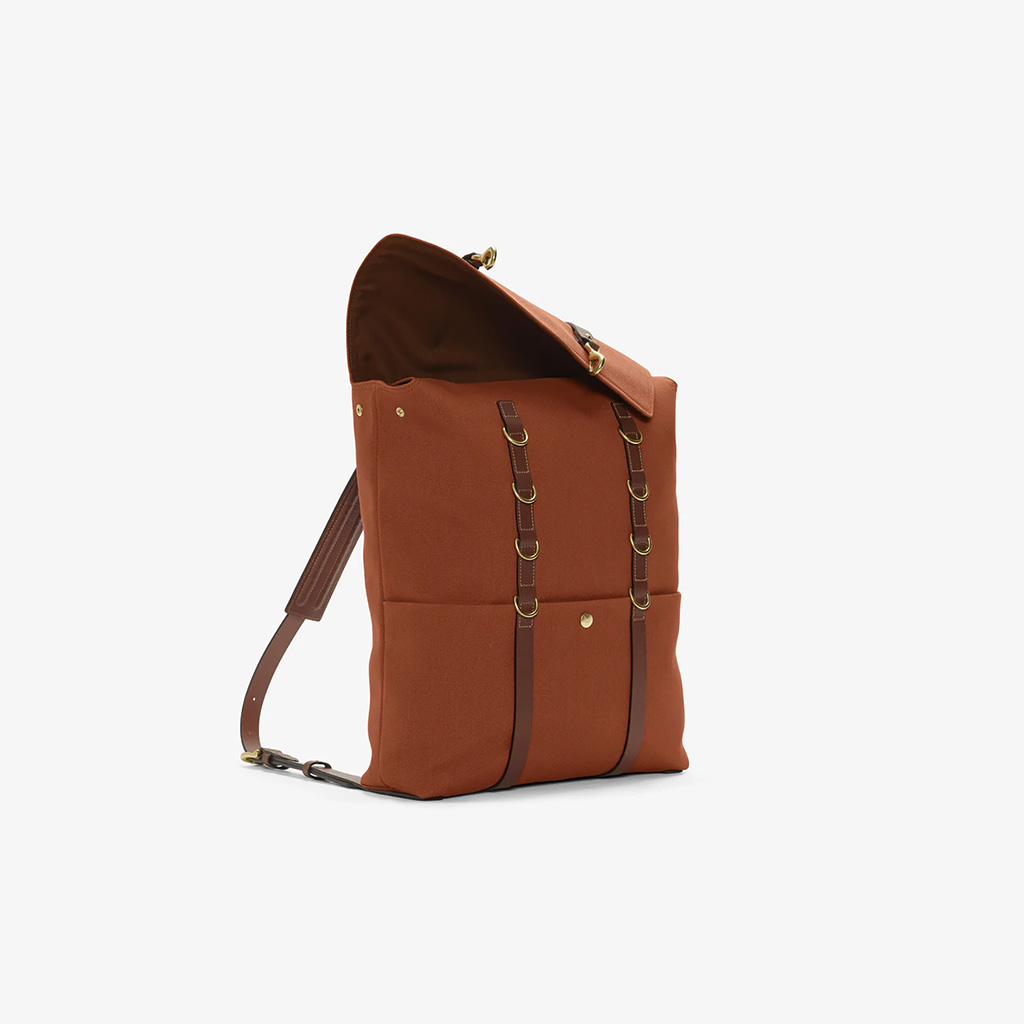 Vier D-Ring-Paare auf der Vorderseite ermöglichen es, den Rucksack je nach Füllmenge in verschiedenen Positionen zu verschließen. Auf der Front befinden sich drei außenliegende Fächer, die durch die markanten Lederstreifen unterteilt sind. Im Inneren bietet ein gepolstertes Laptopfach Platz für Geräte bis zu 16 Zoll sowie ein kleines Reißverschlussfach auf der gegenüberliegenden Seite. Die Schulterriemen lassen sich über solide Messingschnallen individuell anpassen.