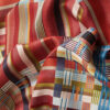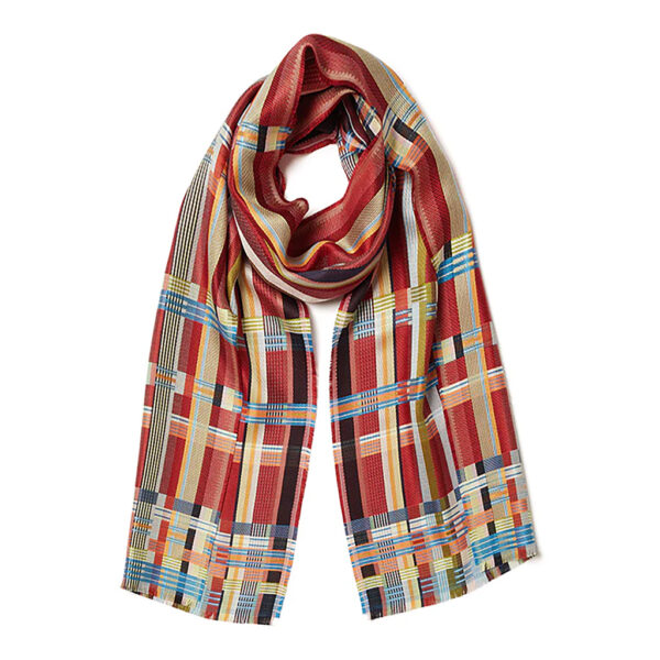 Violette ist ein grafischer Schal aus reiner Seide mit einem multidirektionalen Streifen in kräftigen Unifarben vor einem Hintergrund aus feinen Nadelstreifen. Die Details sind über den gesamten Schal verteilt und verdichten sich am stark gemusterten Rand.
