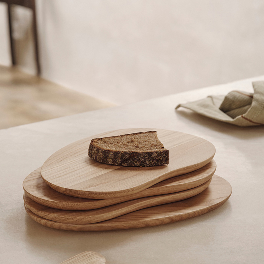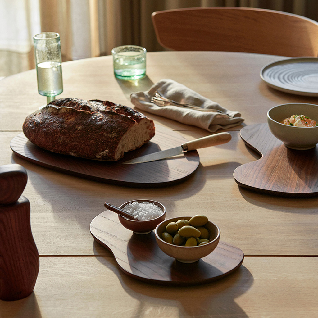 Die Cairn-Schneidebretter zeichnen sich durch ihre Rundungen und skulpturalen Details aus und setzen bei Ihren Mahlzeiten künstlerische Akzente. Die Inspiration dazu stammt von Cairns – von Menschenhand geschaffenen Steinhaufen, die oft zu Erinnerungszwecken errichtet wurden. Diese organischen Holzformen sind aus FSC®-zertifiziertem Eichenholz geschnitzt und besitzen zarte, abgerundete Kanten, die ihnen ihre charakteristische Ausstrahlung verleihen. Verwenden Sie sie sowohl zur Zubereitung von Mahlzeiten in der Küche als auch zum ästhetischen Anrichten von Speisen am Esstisch.