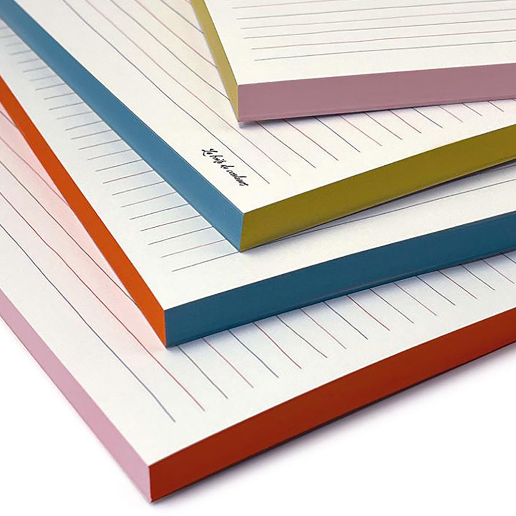 Dezente, verschiedenfarbige horizontale Linien und vier unterschiedlich farbige Farbschnitte auf jeder Seitenkante verleihen dem Schreibblock eine stilvolle und formale Einheit.