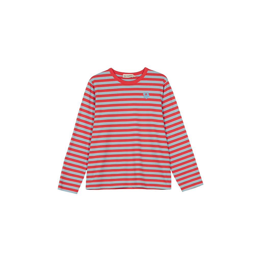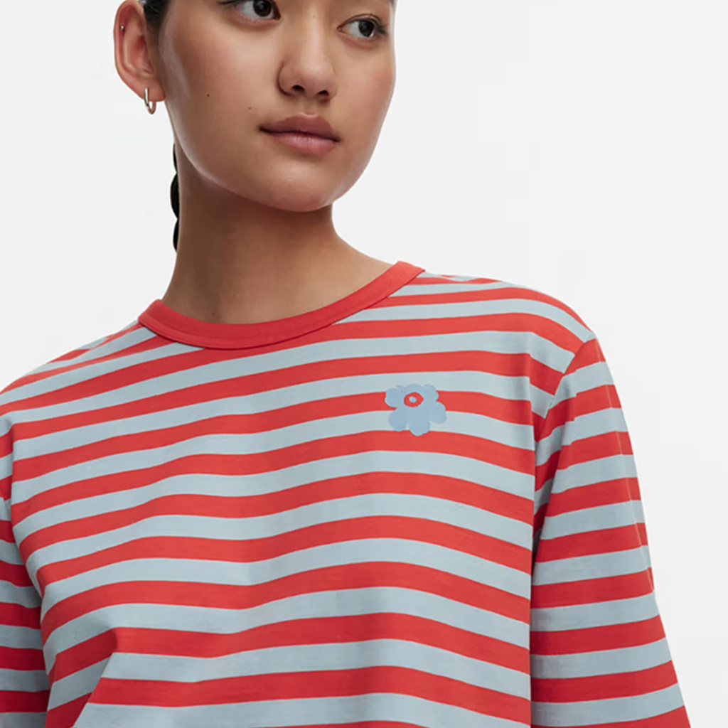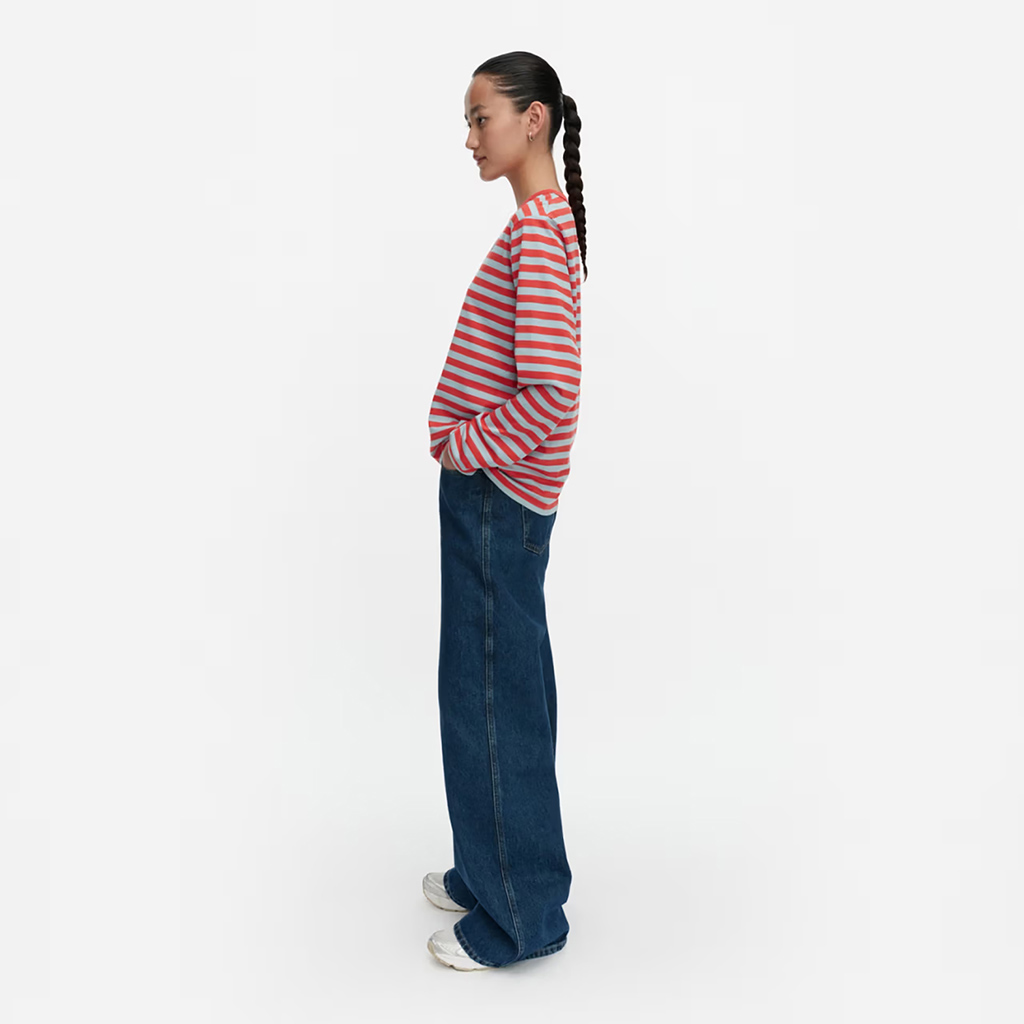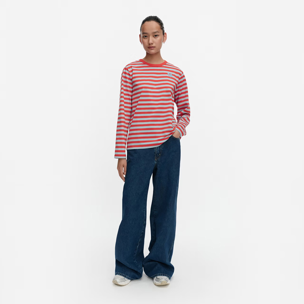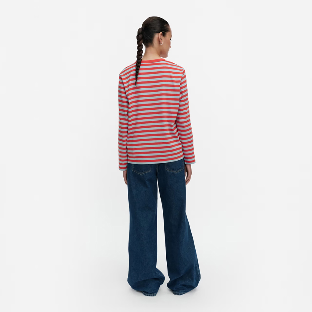 Das locker sitzende Jersey-Shirt ist aus Bio-Baumwolljersey gefertigt und mit dem Tasaraita-Muster sowie der kleinen Unikko-Blume verziert, die auf der Vorderseite aufgedruckt ist. Das langärmelige Jersey-Shirt hat einen gerippten Rundhalsausschnitt. Dieses Produkt besteht zu 100 % aus Bio-Baumwolle. Als Jeans sowohl bei Frauen als auch bei Männern immer beliebter wurden, wollte Annika Rimala eine Kollektion aus Baumwolljersey-Kleidung entwerfen, die zu Jeans passt. Für alle Denim-Liebhaber, unabhängig von Alter, Größe oder Geschlecht.