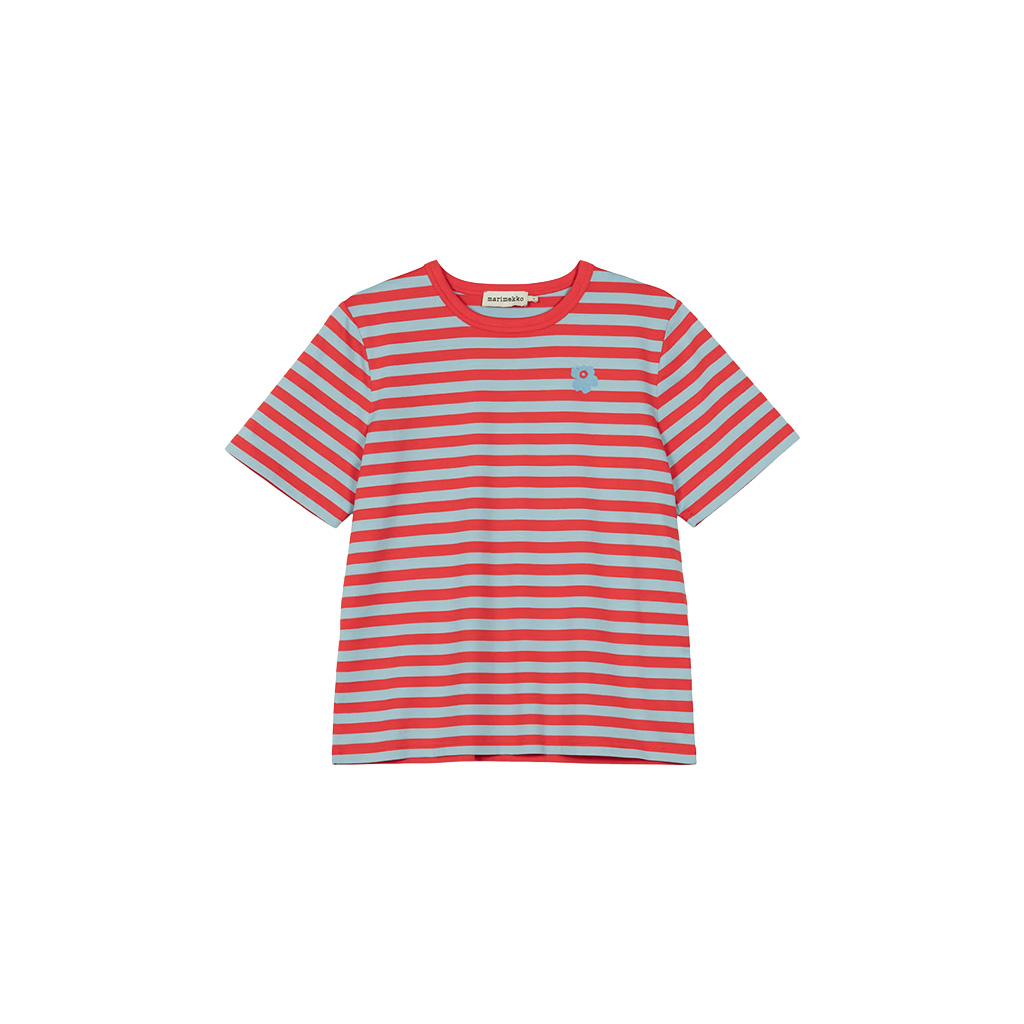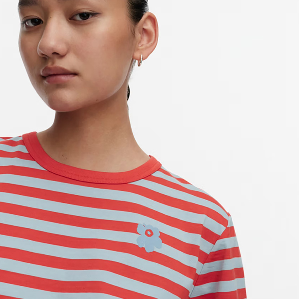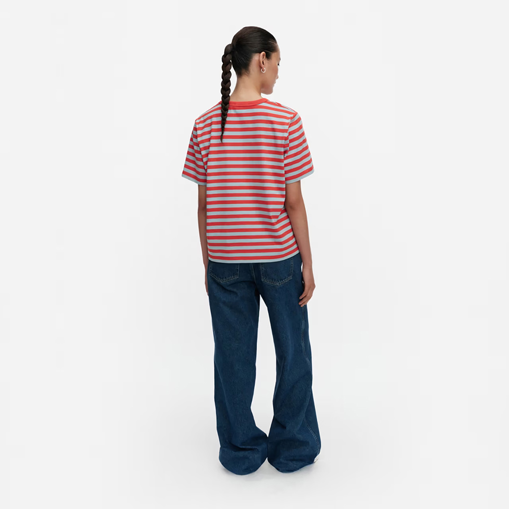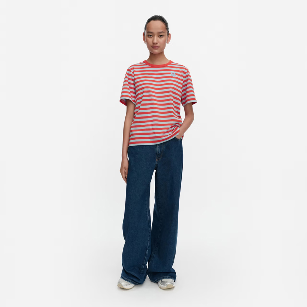 Das locker sitzende T-Shirt ist aus Bio-Baumwolljersey gefertigt und mit dem Tasaraita-Muster sowie der kleinen Unikko-Blume bedruckt, die auf der Vorderseite aufgedruckt ist. Das T-Shirt hat einen gerippten Rundhalsausschnitt. Dieses Produkt besteht zu 100 % aus Bio-Baumwolle. Als Jeans sowohl bei Frauen als auch bei Männern immer beliebter wurden, wollte Annika Rimala eine Kollektion aus Baumwolljersey entwerfen, die zu Jeans passt. Für alle Denim-Liebhaber:innen, unabhängig von Alter, Grösse oder Geschlecht. So entstand die erste Baumwolljersey-Kollektion von Marimekko. Gleichmässig gestreift, als Ausdruck von Gleichheit.
