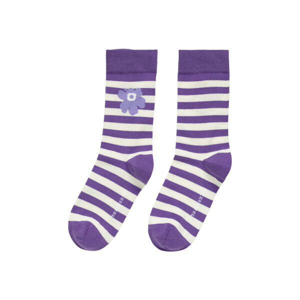 Die Kasvaa-Socken sind aus einer Baumwollmischung gefertigt und zeigen das Tasaraita-Muster (gleichmäßige Streifen) mit der Mohnblume des klassischen Unikko-Musters. Als Jeans sowohl bei Frauen als auch bei Männern immer beliebter wurden, wollte Annika Rimala eine Kollektion von Baumwolljersey-Kleidung entwerfen, die zu Jeans passt. Für alle Denim-Liebhaber, unabhängig von Alter, Größe oder Geschlecht. So wurde die erste Baumwolljersey-Kollektion von Marimekko geboren. Gleichmäßig gestreift, ein Ausdruck der Gleichheit. Das berühmte Mohnblumenmuster Unikko von Marimekko entstand 1964 in einer Zeit, in der die Kollektionen des Designhauses hauptsächlich abstrakte Drucke enthielten. Die Designerin Maija Isola wollte aus diesem organischen Thema etwas Interessantes machen und entwarf eine ganze Reihe von Blumendrucken. Heute steht die ikonische Blume für Kreativität.