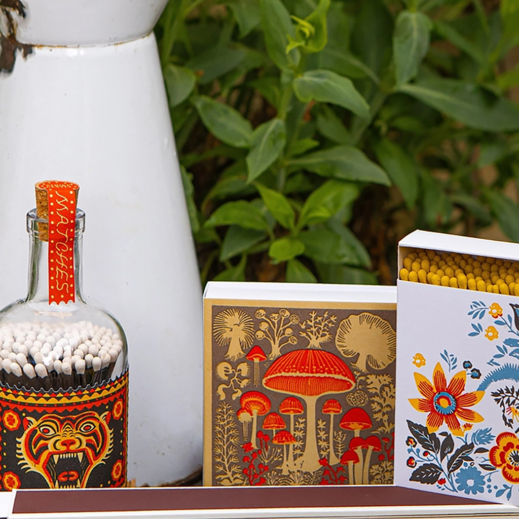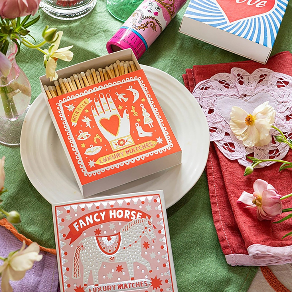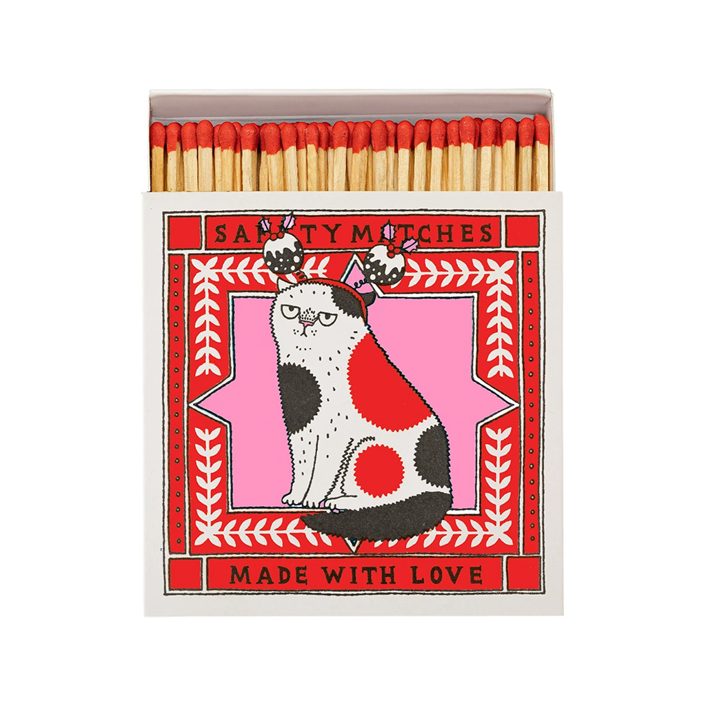 Die charakteristische quadratische Streichholzschachtel von Archivist mit einer mürrischen Katze mit einem Weihnachtspudding-Stirnband auf rosa Hintergrund mit rotem Rand und dem Schriftzug „Made With Love”. Diese in jeder Hinsicht auffälligen Streichholzschachteln enthalten 125 Streichhölzer, die bereit sind, ein wenig Freude zu entfachen. Jede Schachtel wurde entworfen, um Couchtischen, Kaminsimsen und Geschenkschubladen Charakter zu verleihen, und ist eine Mischung aus Funktionalität und Flair.