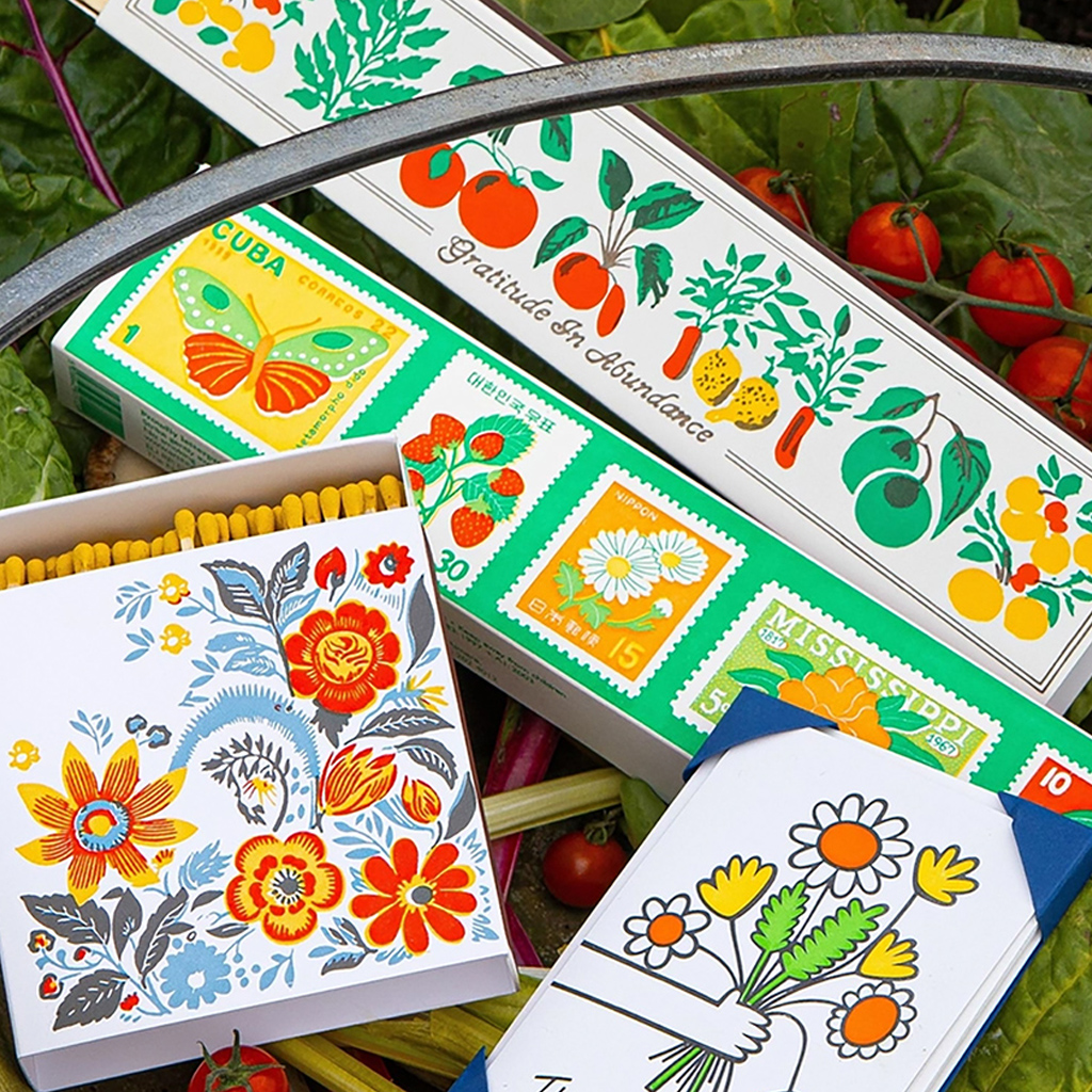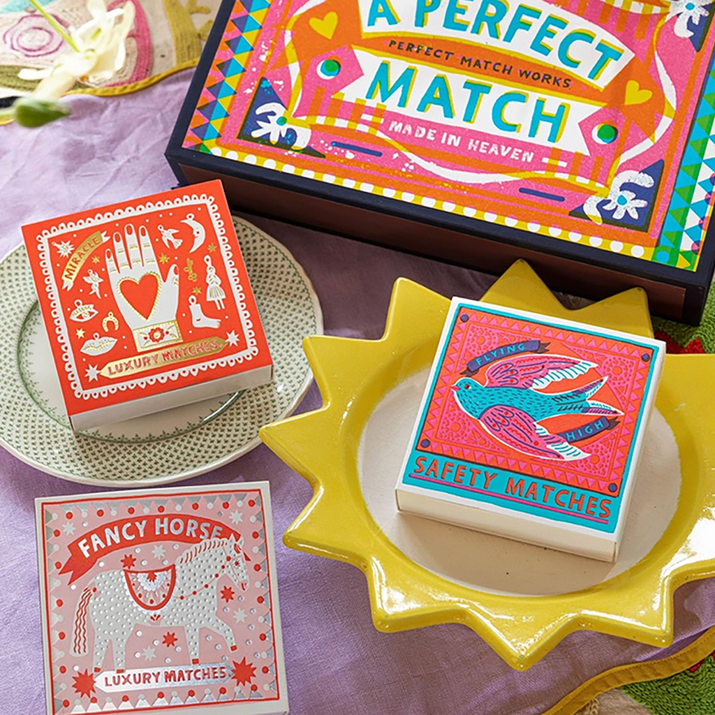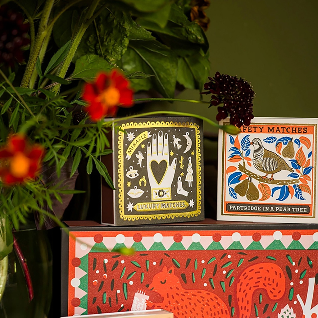 Die charakteristische quadratische Streichholzschachtel von Archivist mit einer mürrischen Katze mit einem Weihnachtspudding-Stirnband auf rosa Hintergrund mit rotem Rand und dem Schriftzug „Made With Love”. Diese in jeder Hinsicht auffälligen Streichholzschachteln enthalten 125 Streichhölzer, die bereit sind, ein wenig Freude zu entfachen. Jede Schachtel wurde entworfen, um Couchtischen, Kaminsimsen und Geschenkschubladen Charakter zu verleihen, und ist eine Mischung aus Funktionalität und Flair.