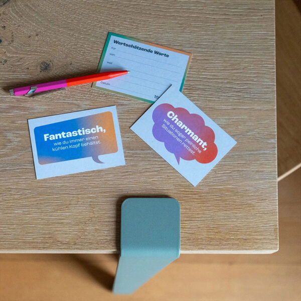 Wertschätzung, Anerkennung und Lob kommen im Alltag oft viel zu kurz. Ein wichtiges Projekt wurde erfolgreich abgeschlossen? Schon eilt man zum nächsten. Das Lieblings-Joghurt steht immer im Kühlschrank – und wird so zur Selbstverständlichkeit. Die Tochter hat eine heikle Aufgabe geschickt gelöst – aber das liegt ihr halt auch. Die Freundin hat immer ein offenes Ohr – es wird schon fast zur Selbstverständlichkeit. Die Wertschätzungskarten erinnern daran, Lob und Anerkennung bewusst auszusprechen und weiterzugeben. Jedes Set enthält 30 Karten mit unterschiedlichen Botschaften (3 davon leer), die auf der Rückseite mit ein paar persönlichen Worten ergänzt werden können. Ideal, um auf der Arbeit,, zu Hause oder in der Partnerschaft und in Freundschaften mehr Dankbarkeit und Verbundenheit zu schaffen.